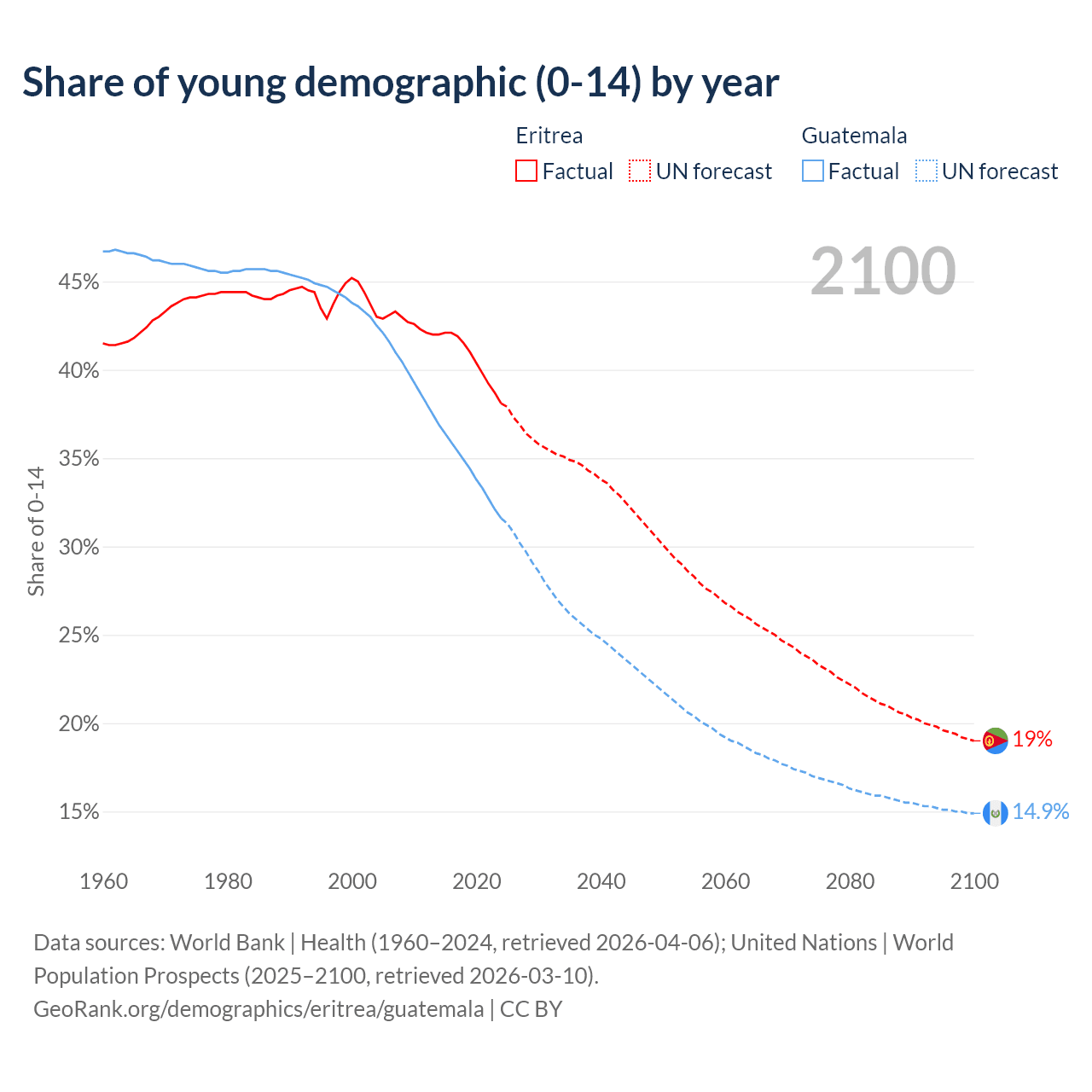 - The share of young demographic (0-15 years old) in Eritrea is 38.1% vs 31.6% in Guatemala.