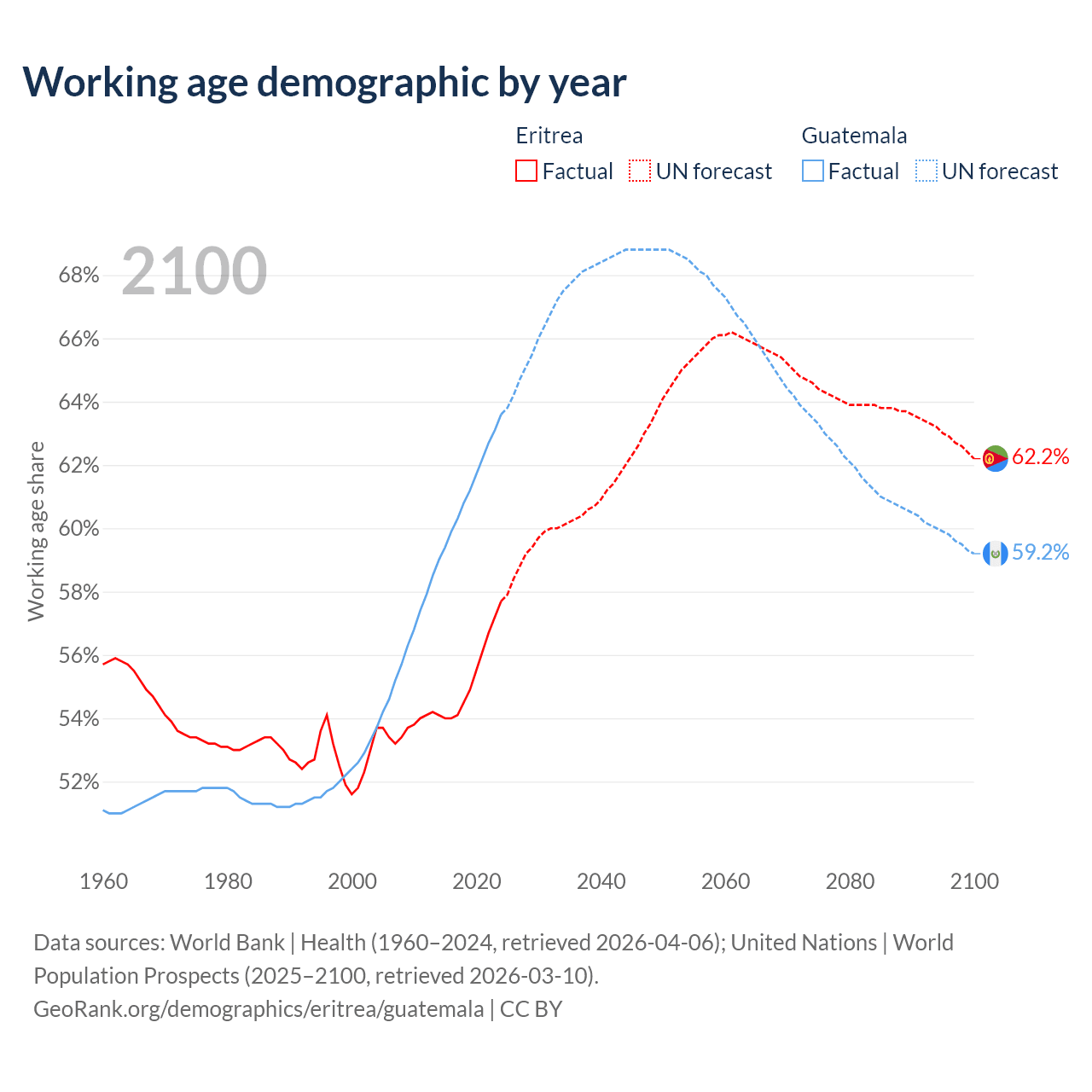 Median age Eritrea vs Guatemala, 1960-2100
