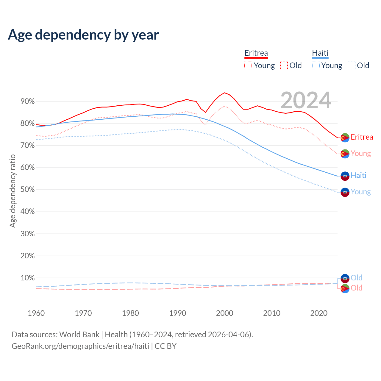 - Eritrea is ranked 168/196 by median age (oldest to youngest) vs 135/196 for Haiti.
