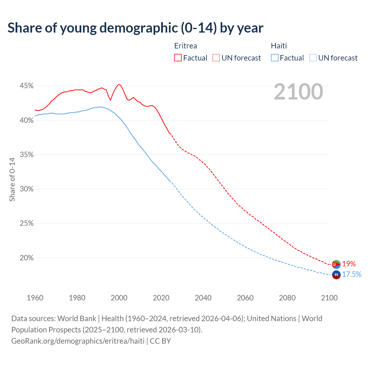 - The share of young demographic (0-15 years old) in Eritrea is 38.1% vs 31.2% in Haiti.