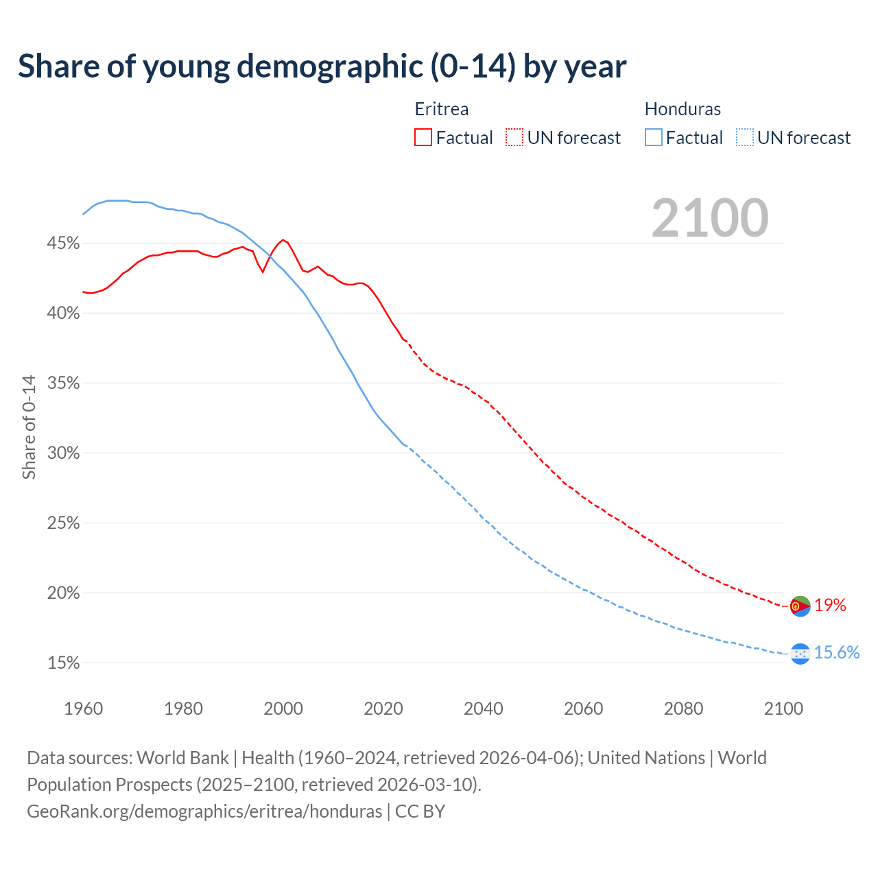 - The share of young demographic (0-15 years old) in Eritrea is 38.1% vs 30.6% in Honduras.
