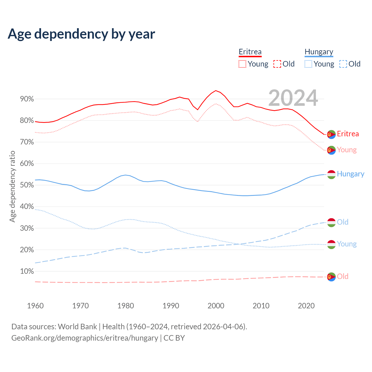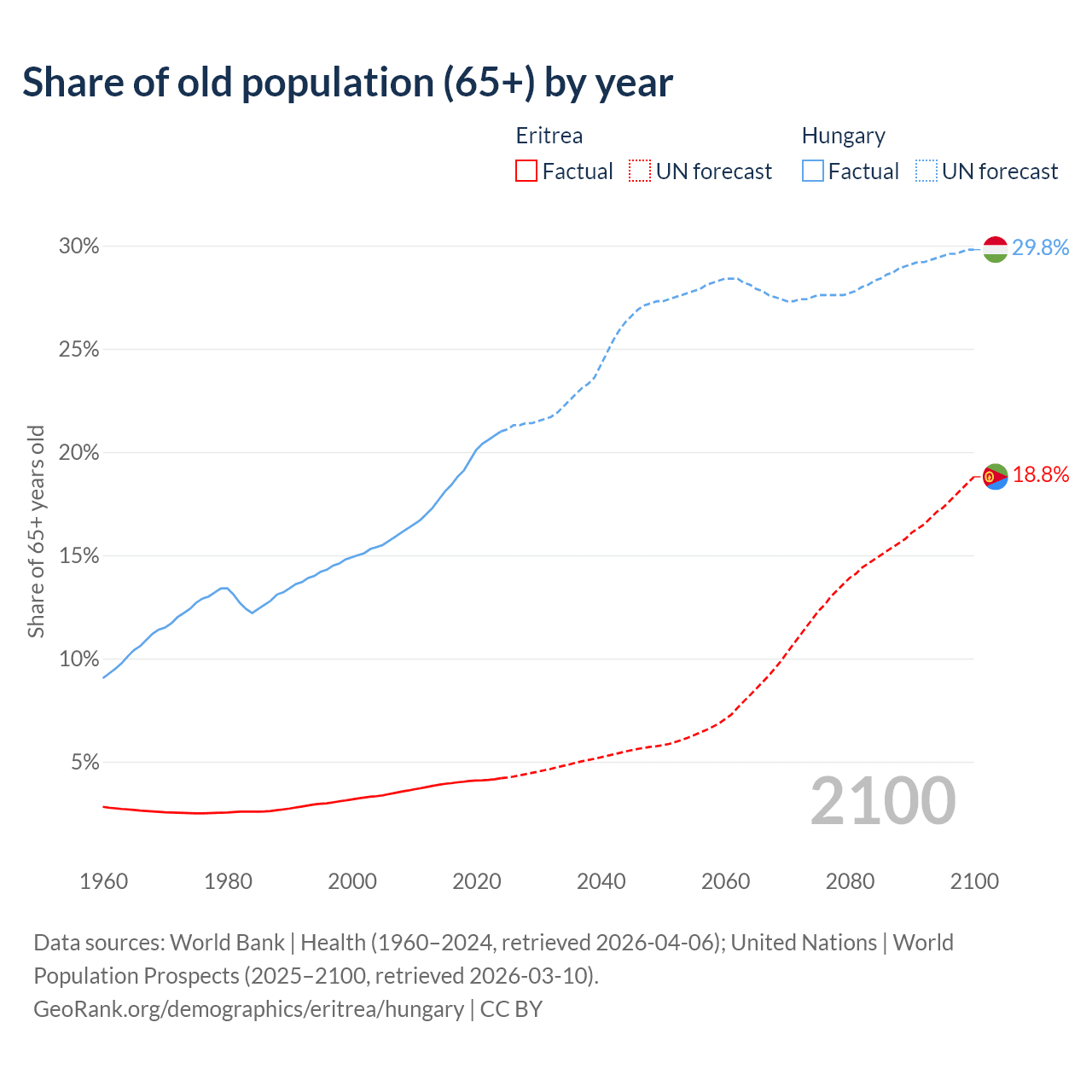 The share of older people aged 65 and over is 4.2% in Eritrea and 21% in Hungary. Life expectancy in Eritrea compared to Hungary .