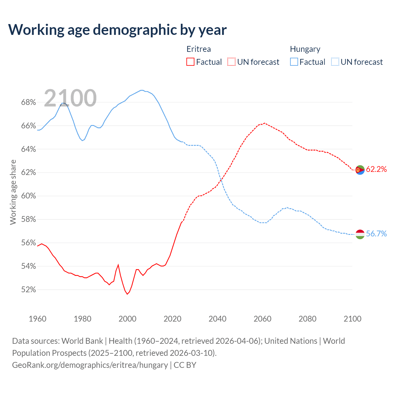 - Eritrea has 2.13M working age adults (aged 15-64) vs 6.12M in Hungary.