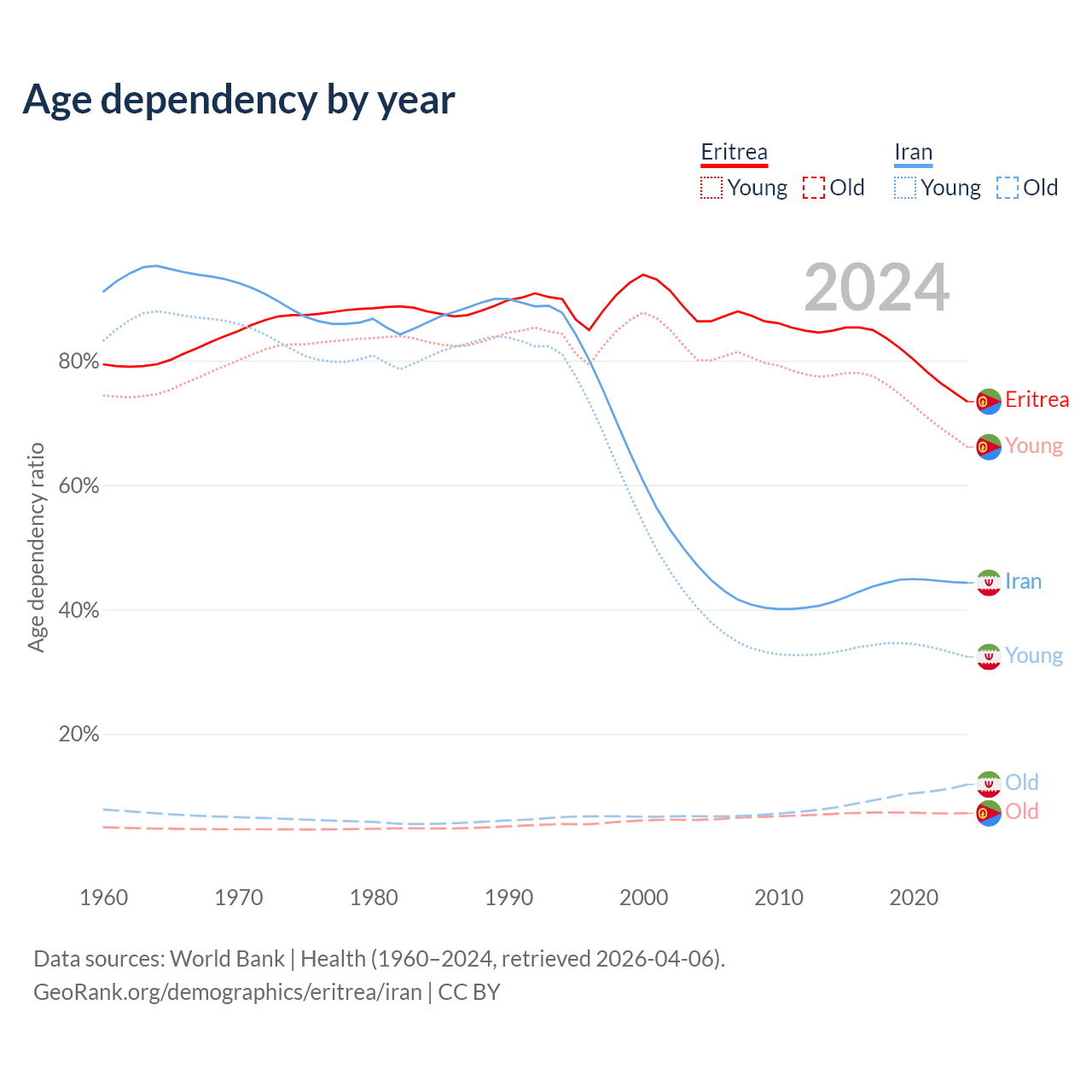 The share of older people aged 65 and over is 4.2% in Eritrea and 8.24% in Iran. Life expectancy in Eritrea compared to Iran .