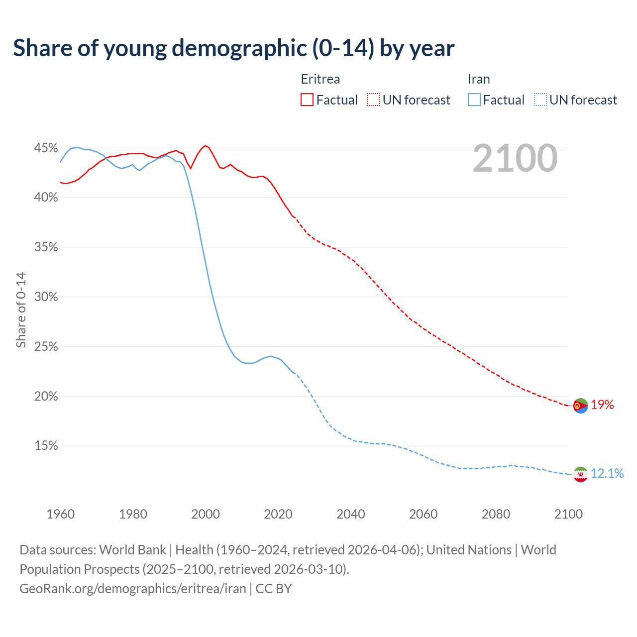 - The share of young demographic (0-15 years old) in Eritrea is 38.1% vs 22.4% in Iran.
