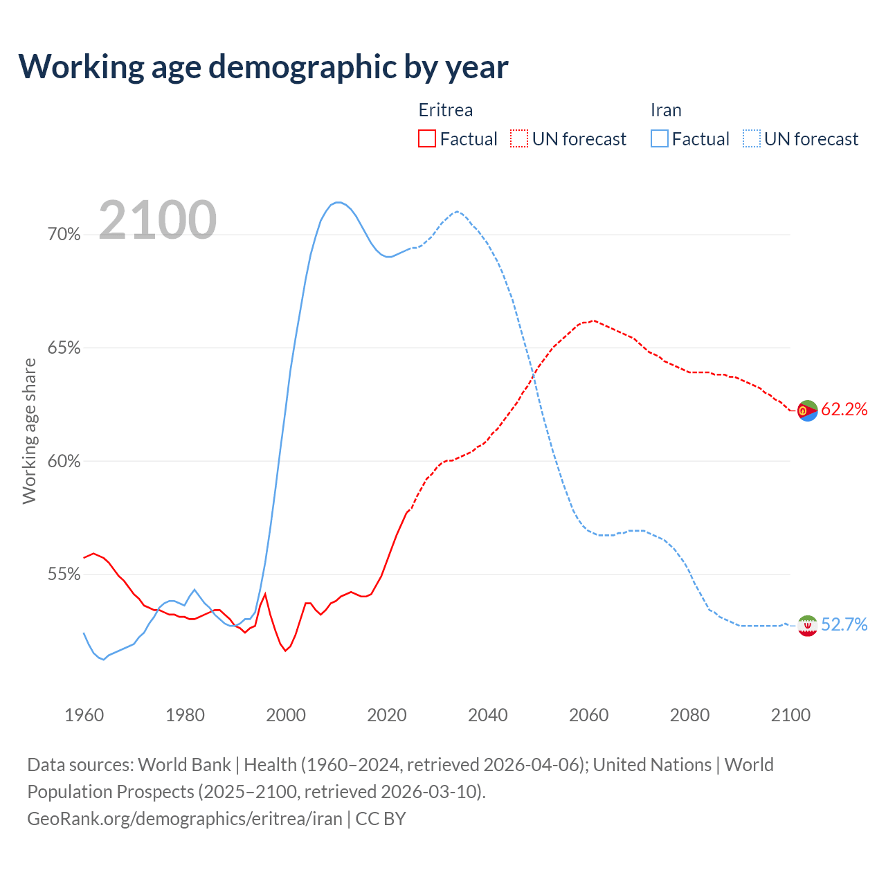 - Eritrea has 2.13M working age adults (aged 15-64) vs 64.8M in Iran.