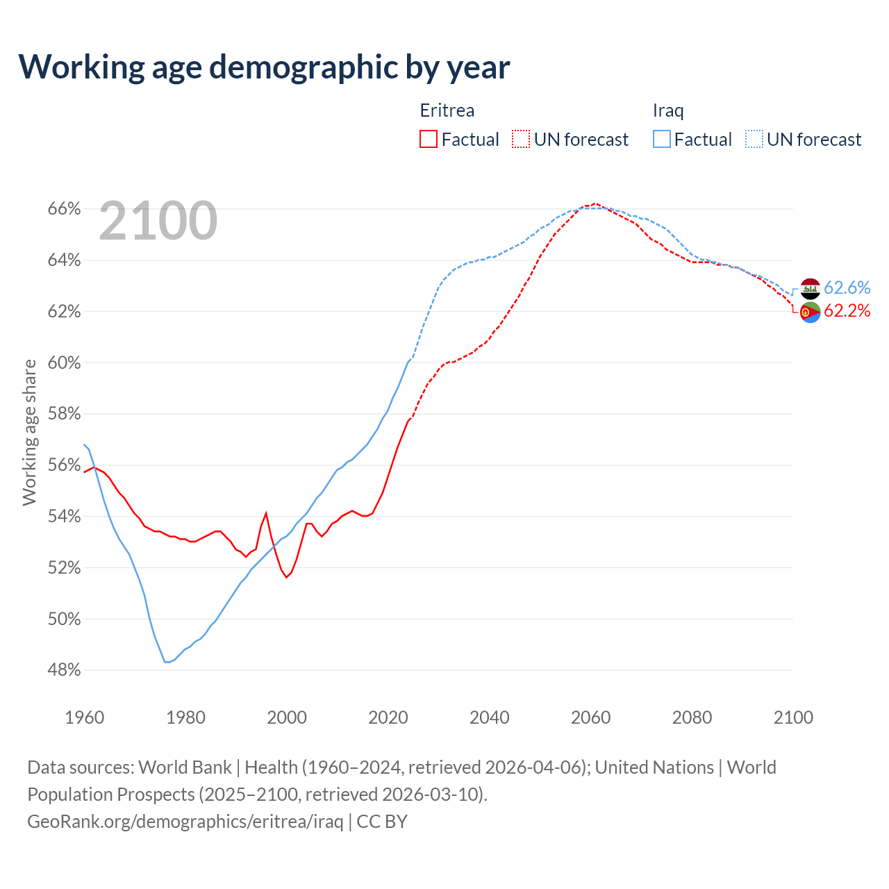 The share of older people aged 65 and over is 4.2% in Eritrea and 3.41% in Iraq. Life expectancy in Eritrea compared to Iraq .