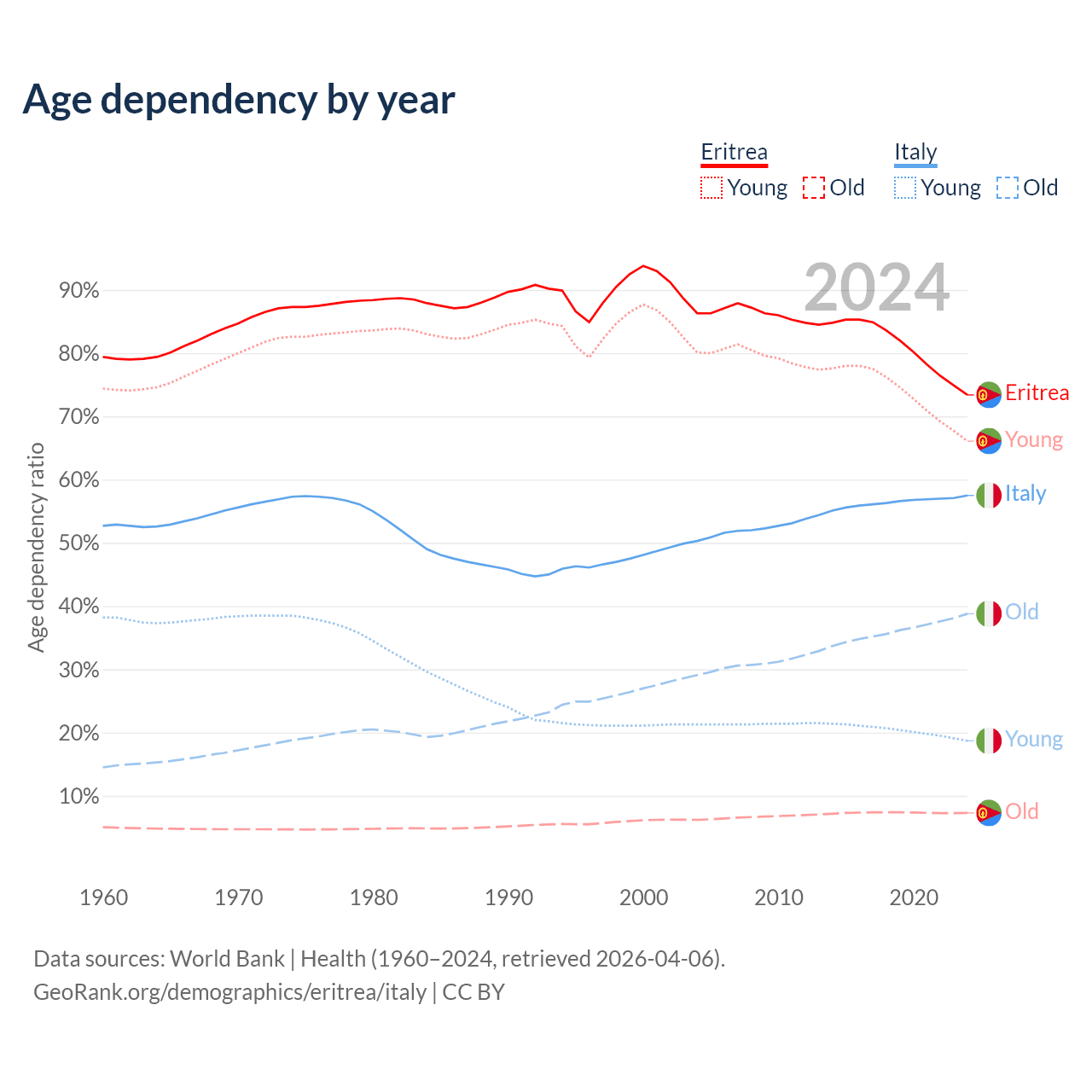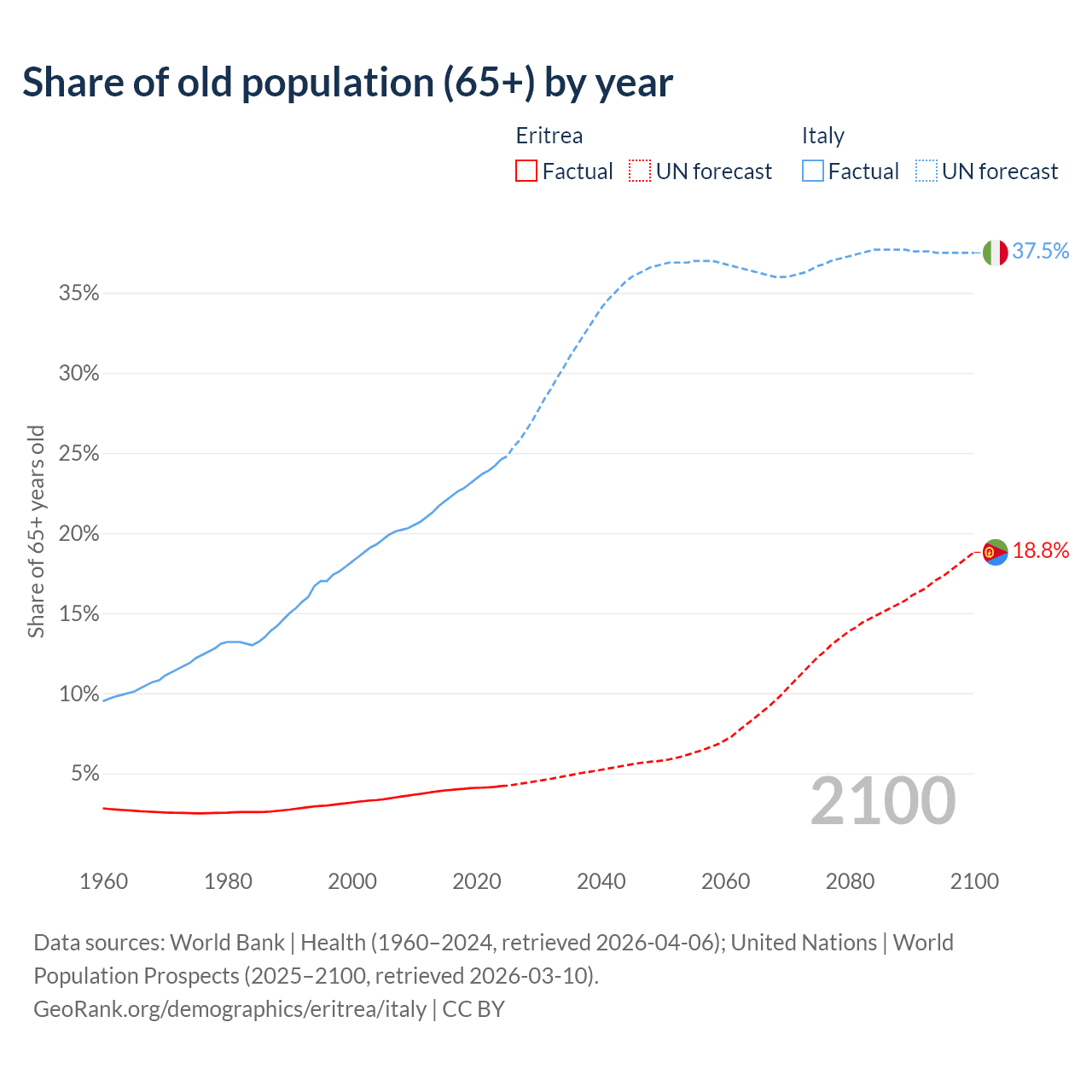 The share of older people aged 65 and over is 4.2% in Eritrea and 24.6% in Italy. Life expectancy in Eritrea compared to Italy .
