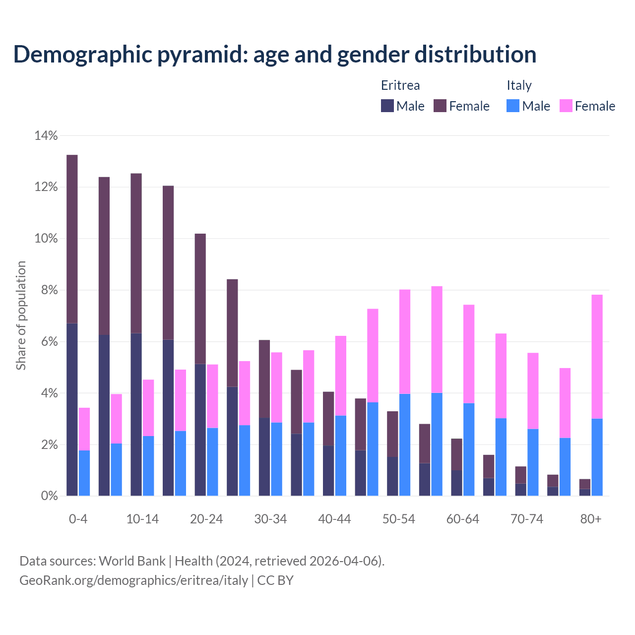 - Eritrea is ranked 168/196 by median age (oldest to youngest) vs 4/196 for Italy.