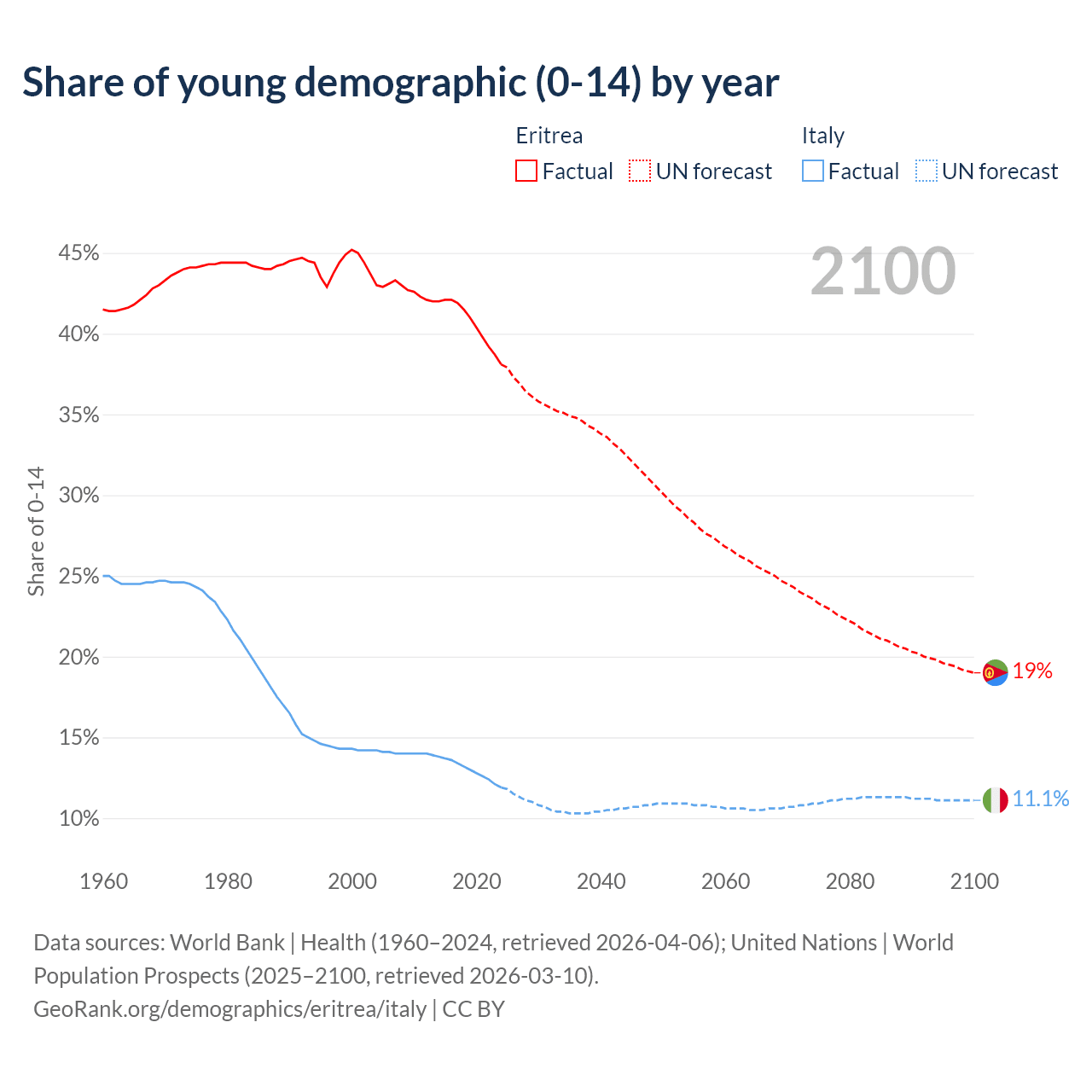 - The share of young demographic (0-15 years old) in Eritrea is 38.1% vs 11.9% in Italy.