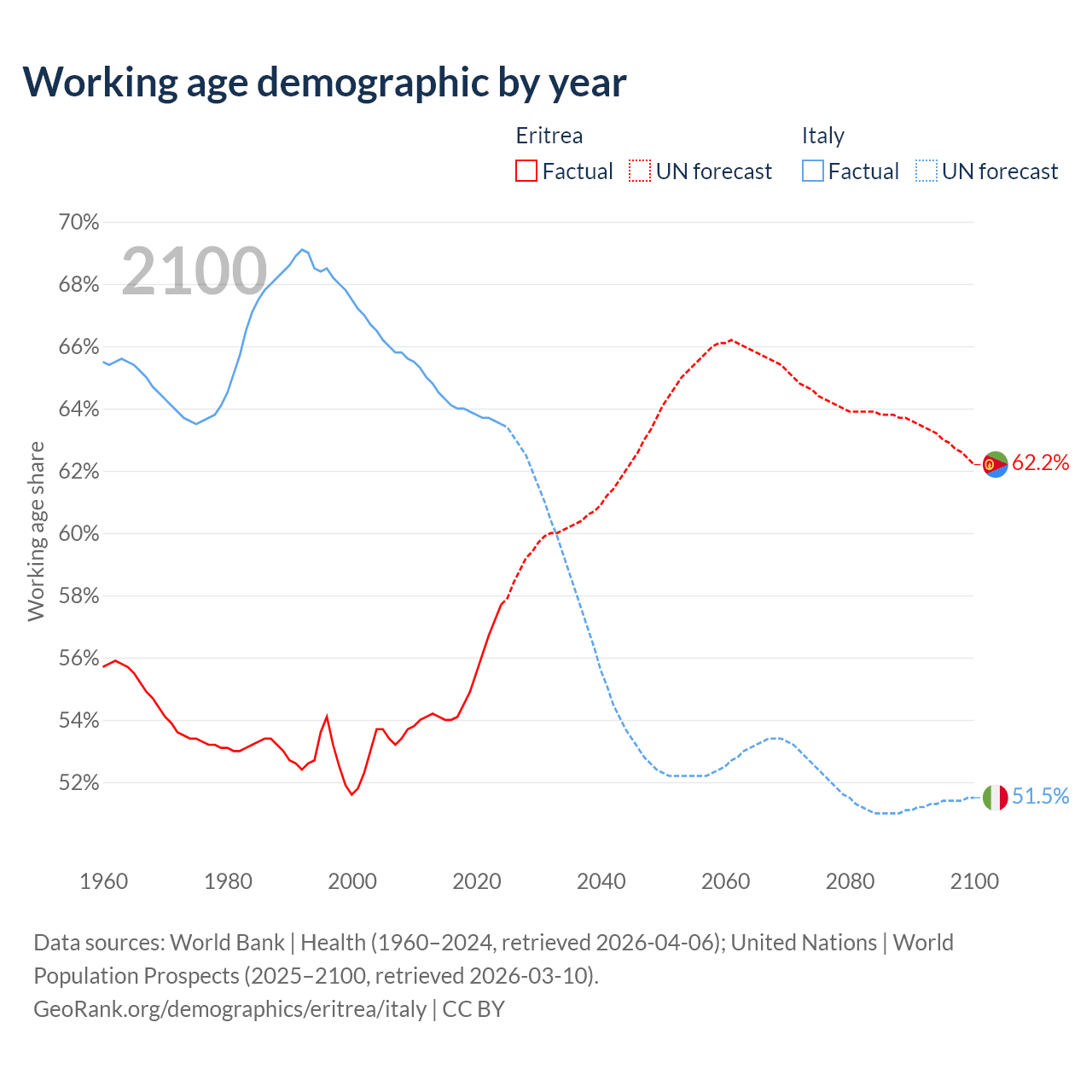 - Eritrea has 2.13M working age adults (aged 15-64) vs 37.2M in Italy.
