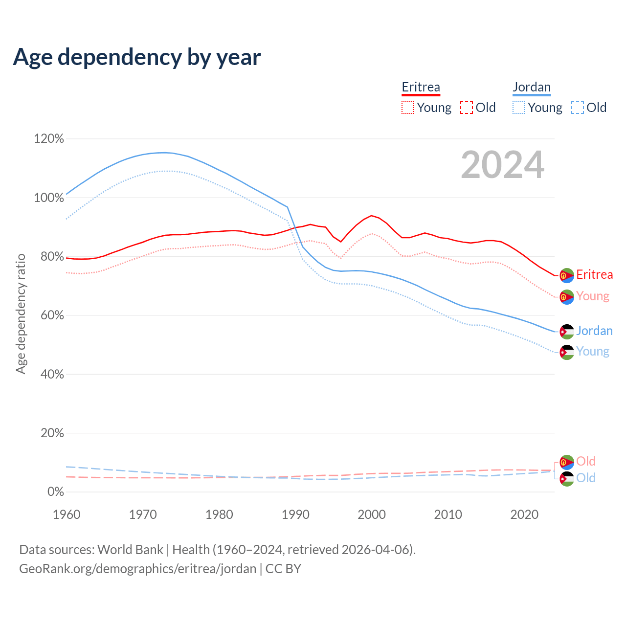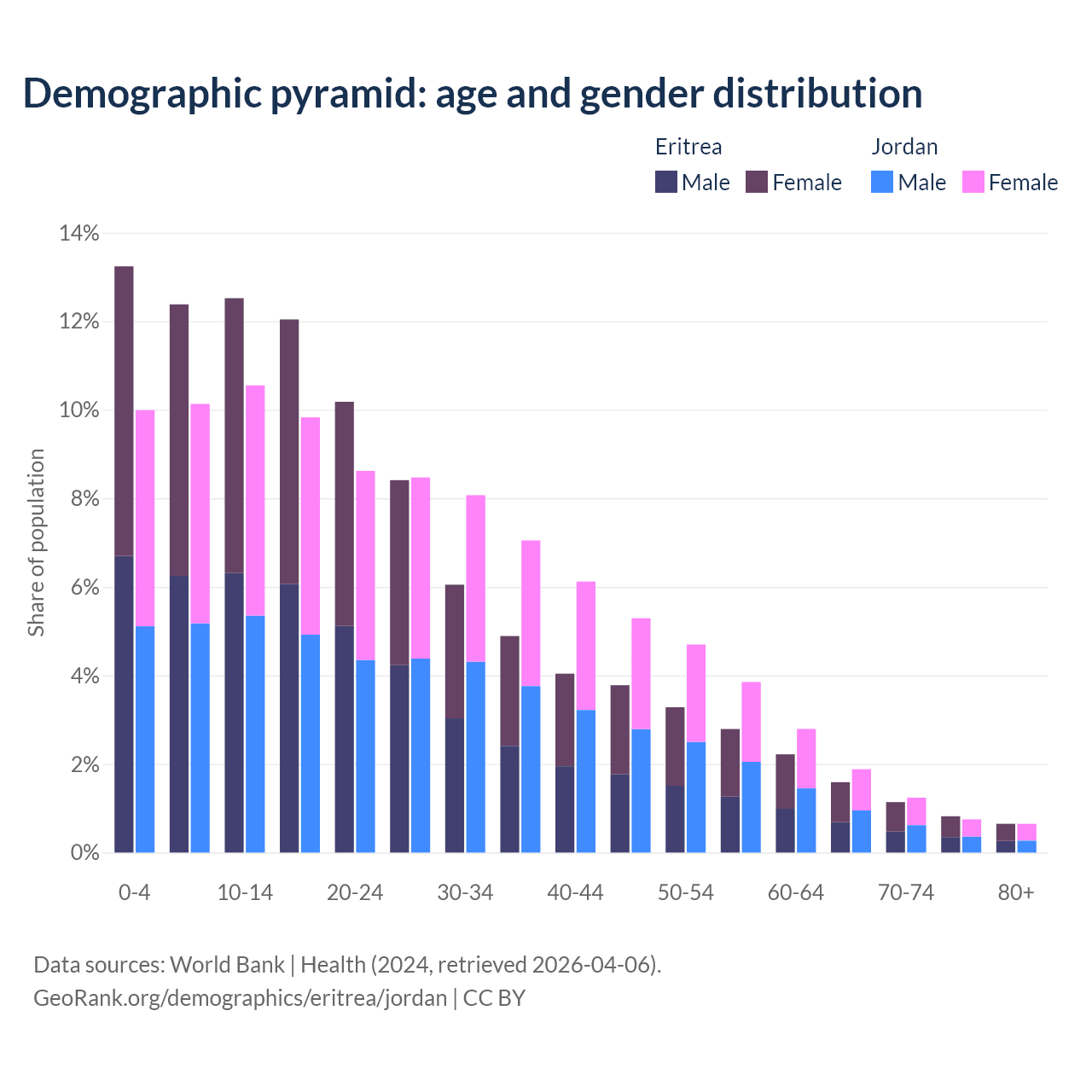 - Eritrea is ranked 168/196 by median age (oldest to youngest) vs 131/196 for Jordan.