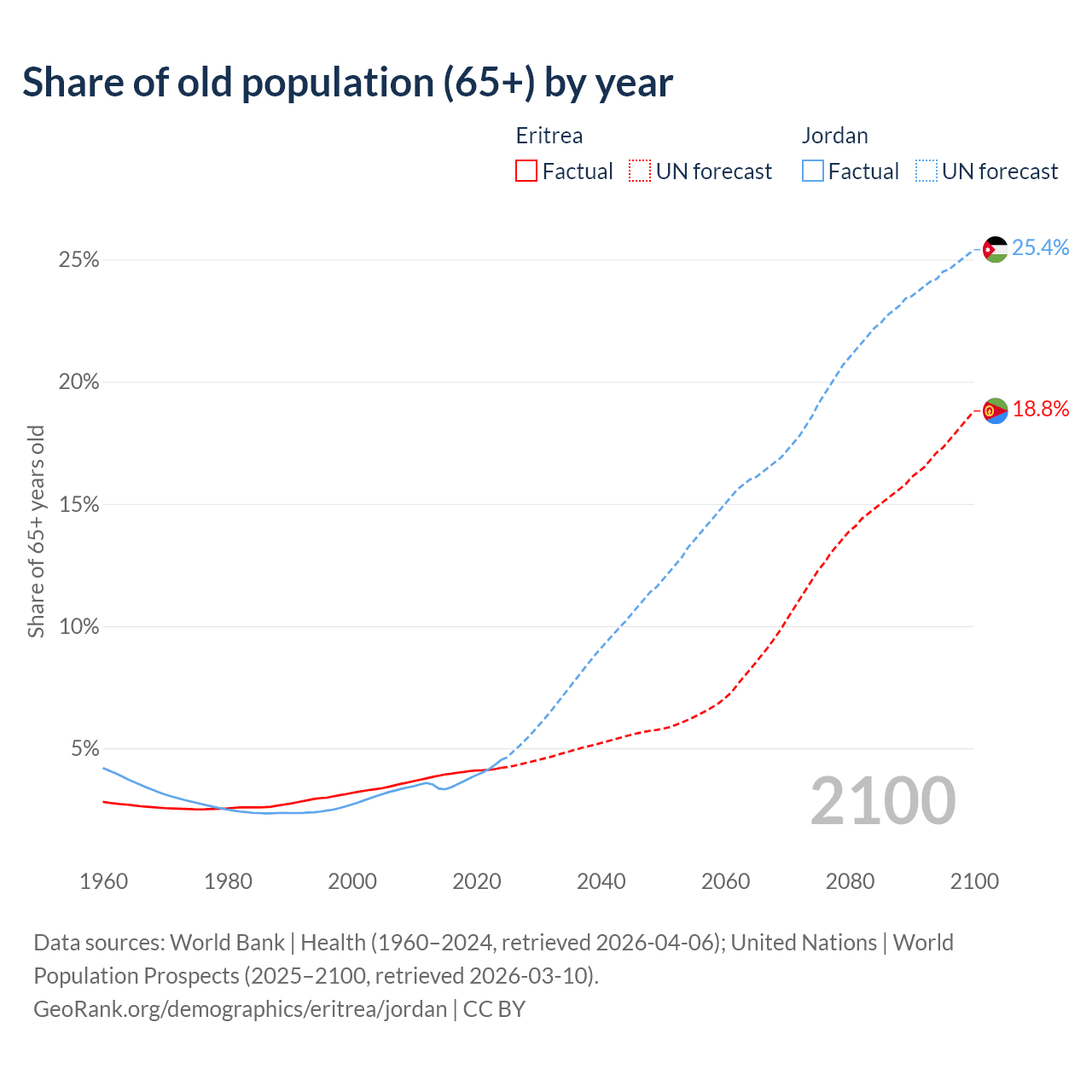 The share of older people aged 65 and over is 4.2% in Eritrea and 4.52% in Jordan. Life expectancy in Eritrea compared to Jordan .