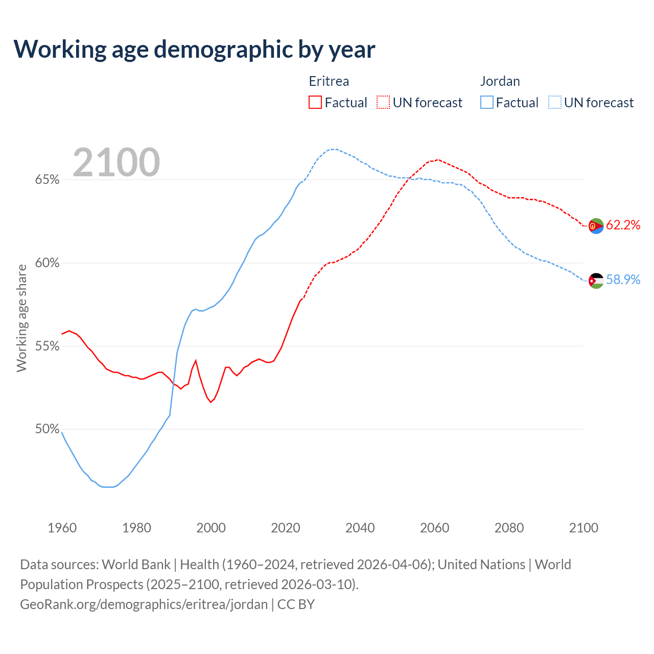- Eritrea has 2.13M working age adults (aged 15-64) vs 7.49M in Jordan.