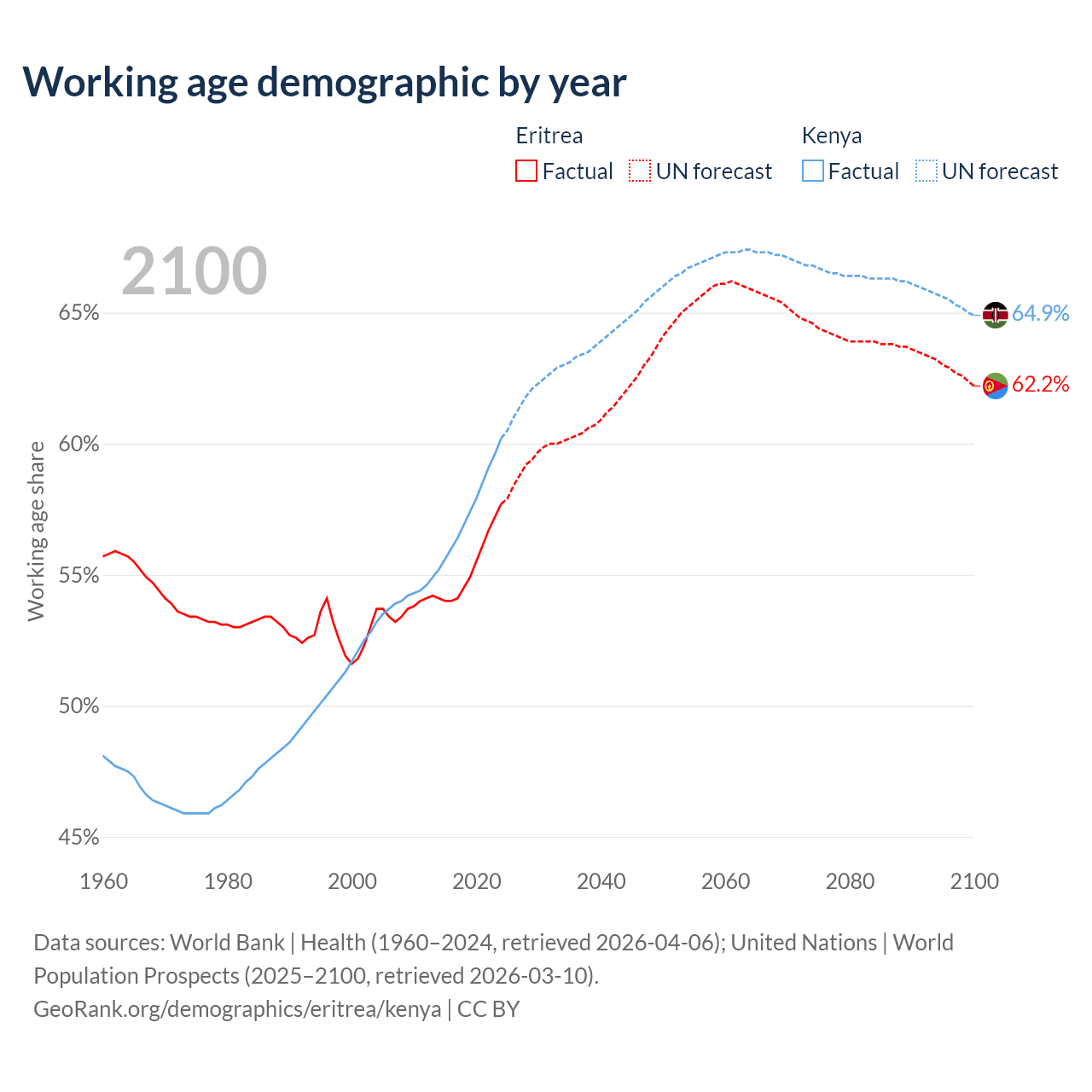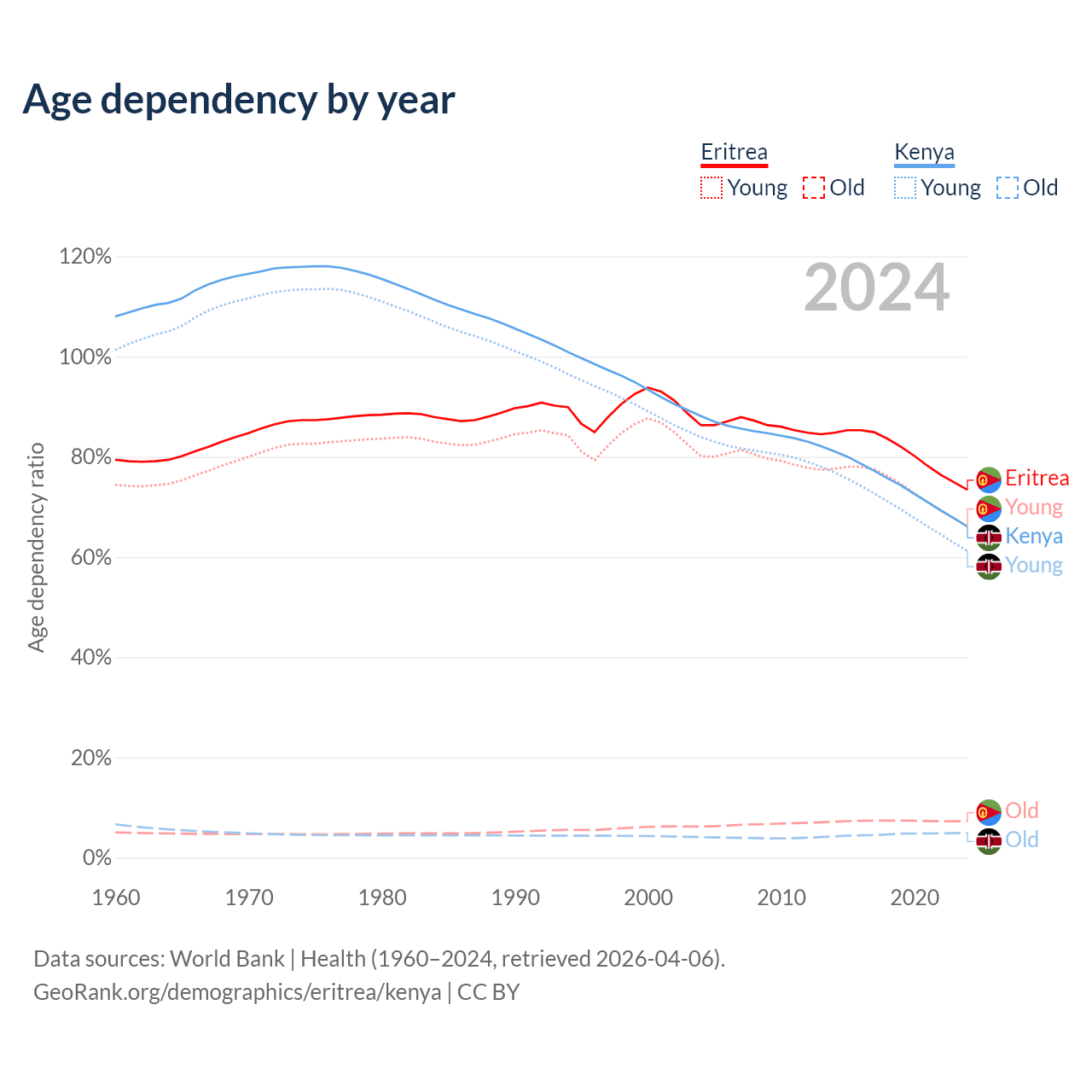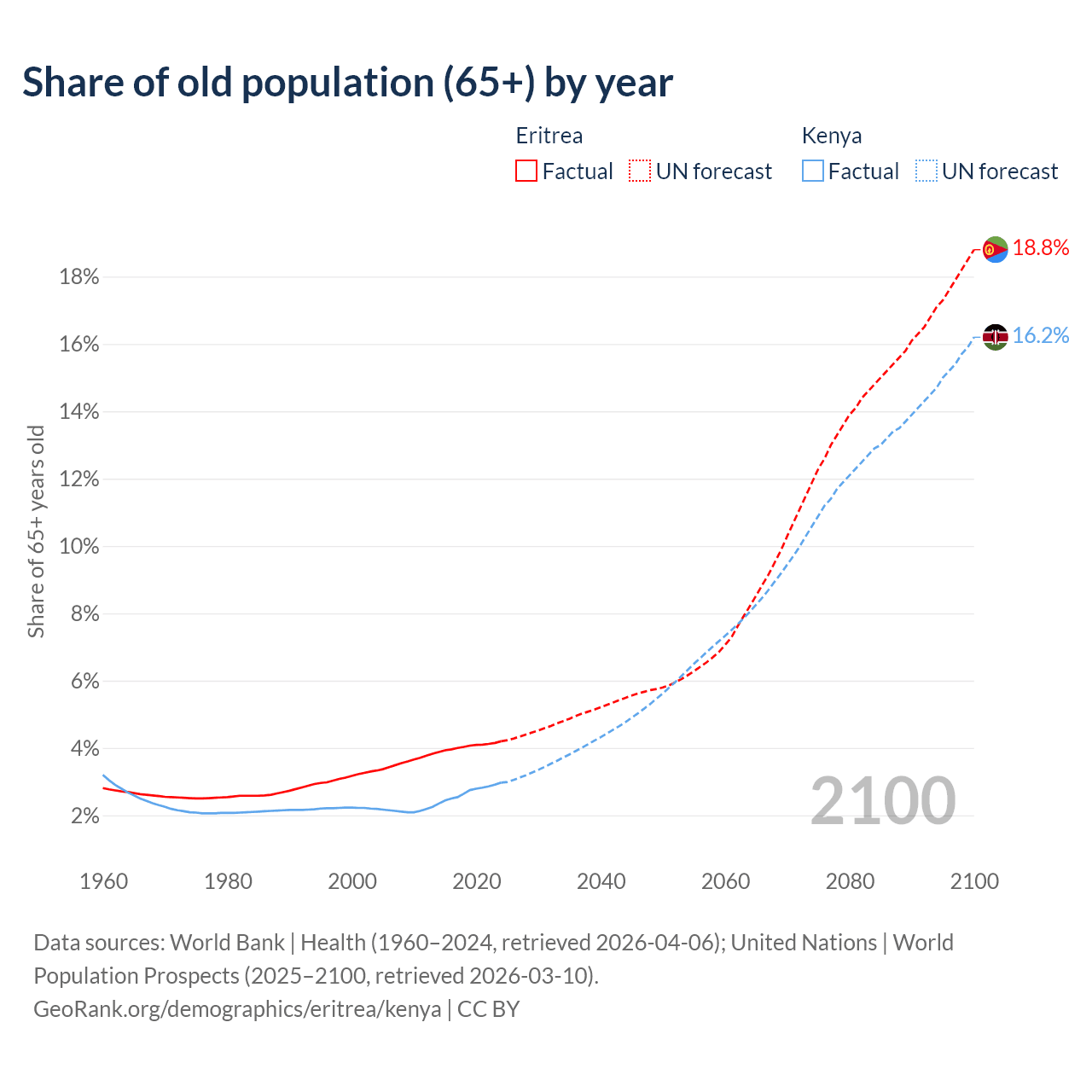 The share of older people aged 65 and over is 4.2% in Eritrea and 2.97% in Kenya. Life expectancy in Eritrea compared to Kenya .