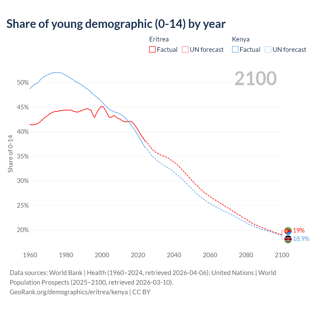 Median age Eritrea vs Kenya, 1960-2100