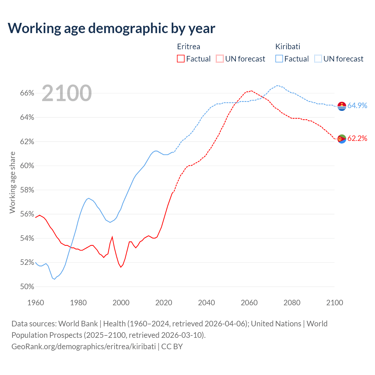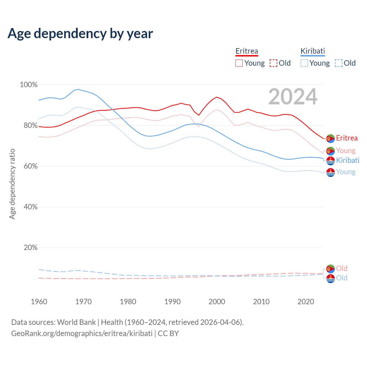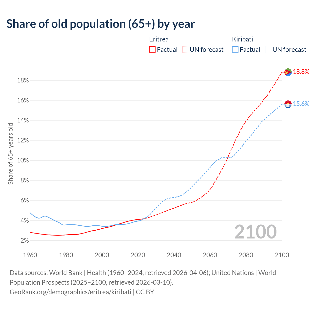 The share of older people aged 65 and over is 4.2% in Eritrea and 4.24% in Kiribati. Life expectancy in Eritrea compared to Kiribati .