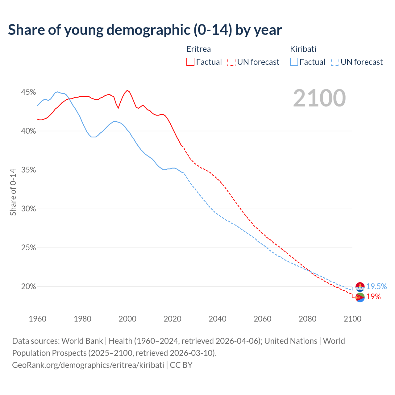 - The share of young demographic (0-15 years old) in Eritrea is 38.1% vs 34.7% in Kiribati.