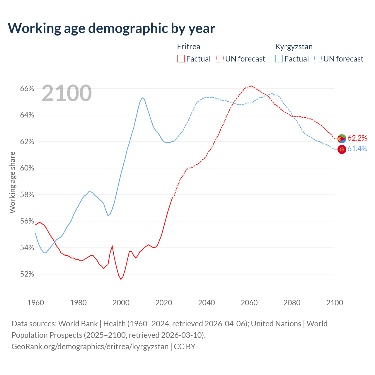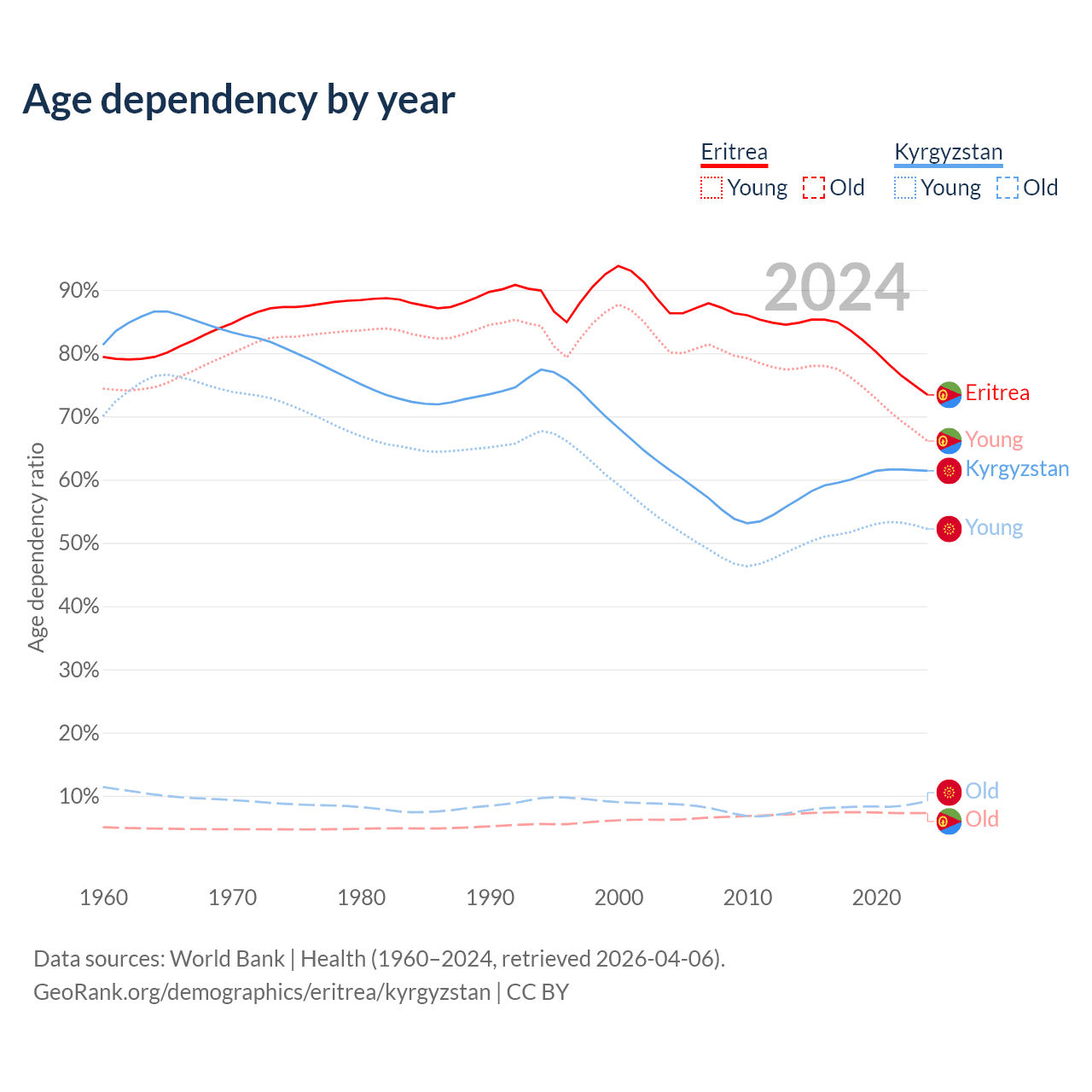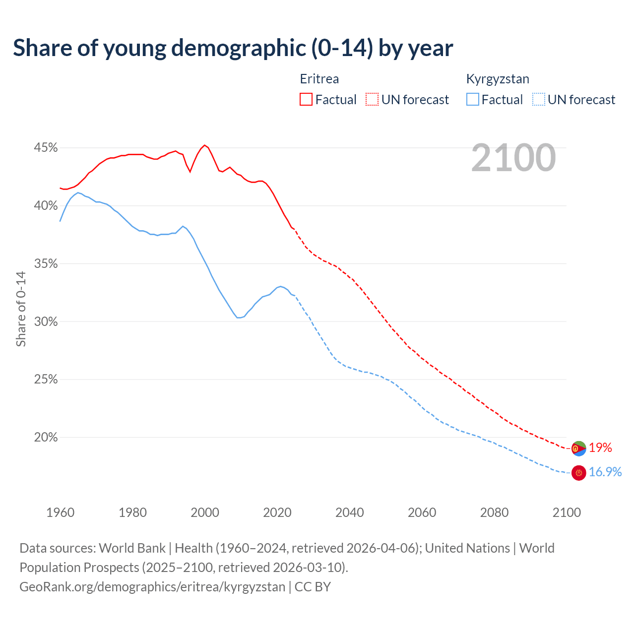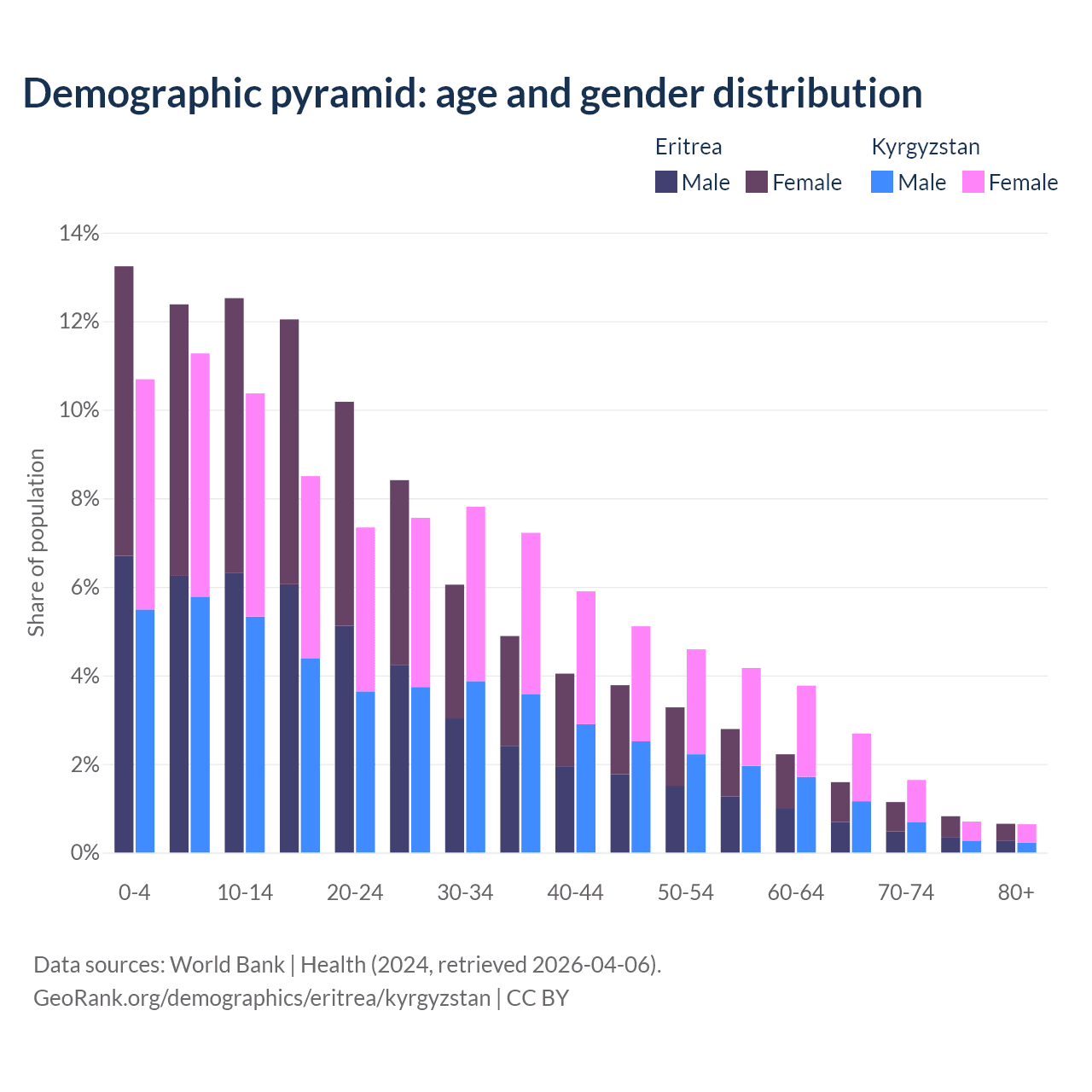 - The share of young demographic (0-15 years old) in Eritrea is 38.1% vs 32.3% in Kyrgyzstan.