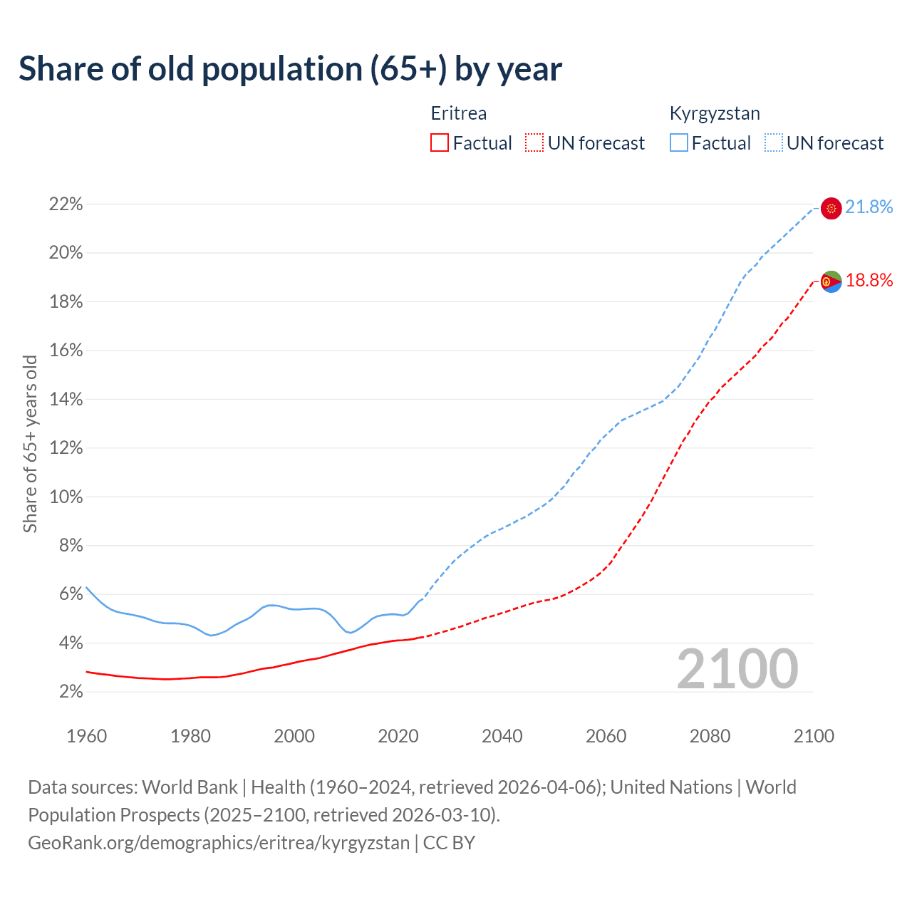 The share of older people aged 65 and over is 4.2% in Eritrea and 5.68% in Kyrgyzstan. Life expectancy in Eritrea compared to Kyrgyzstan .