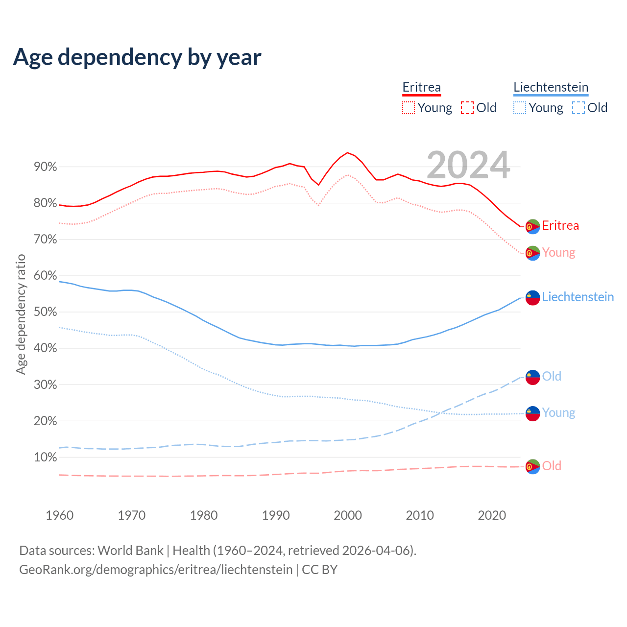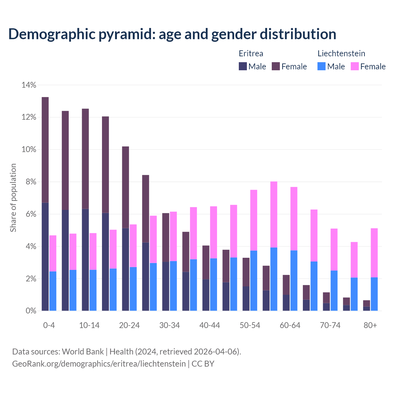 - The share of old-age demographic (65+) in Eritrea is 4.2% vs 20.7% in Liechtenstein.