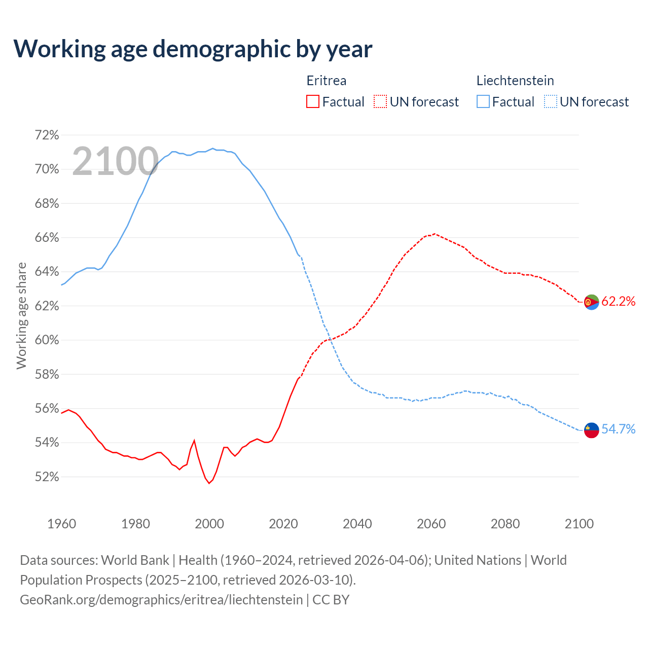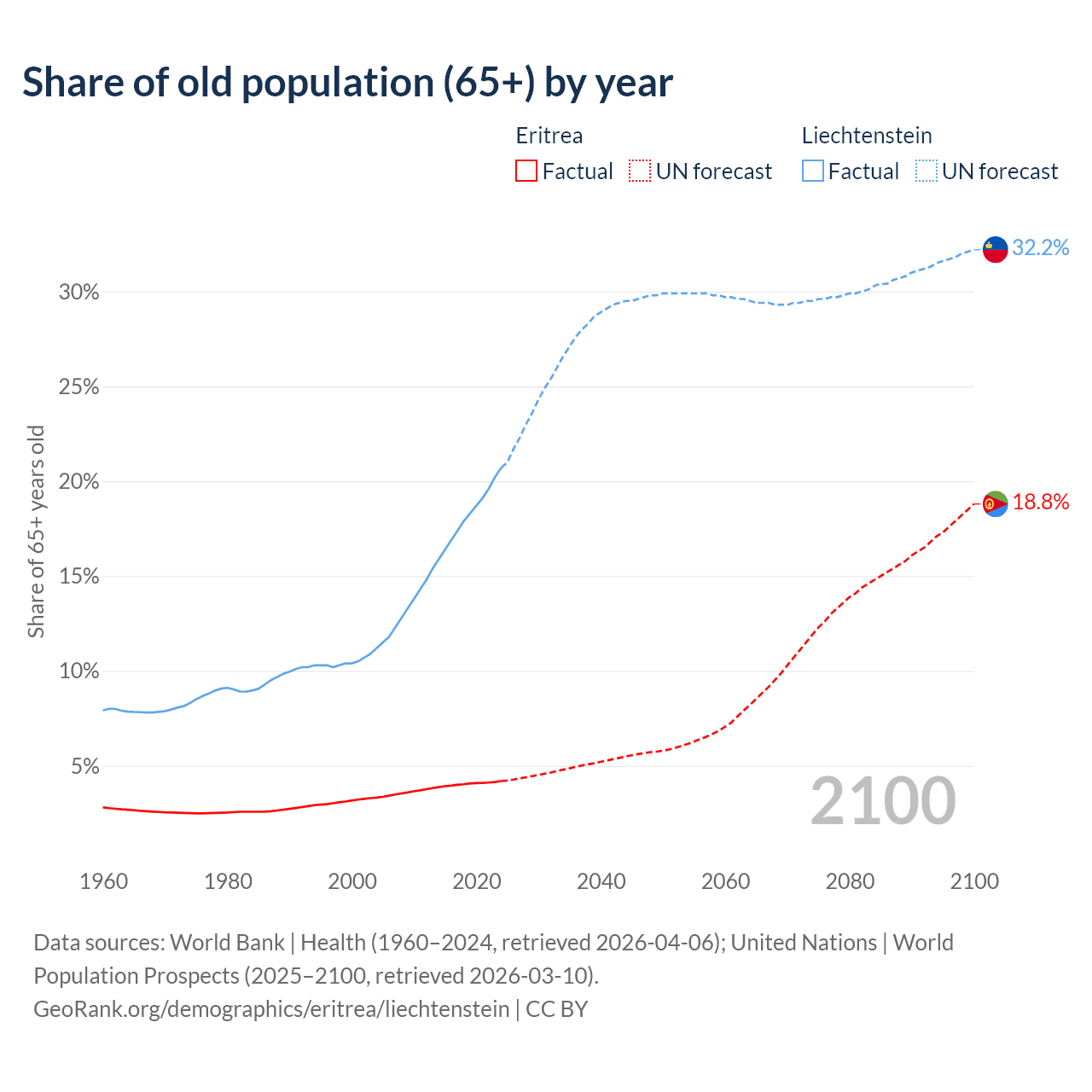 The share of older people aged 65 and over is 4.2% in Eritrea and 20.7% in Liechtenstein. Life expectancy in Eritrea compared to Liechtenstein .