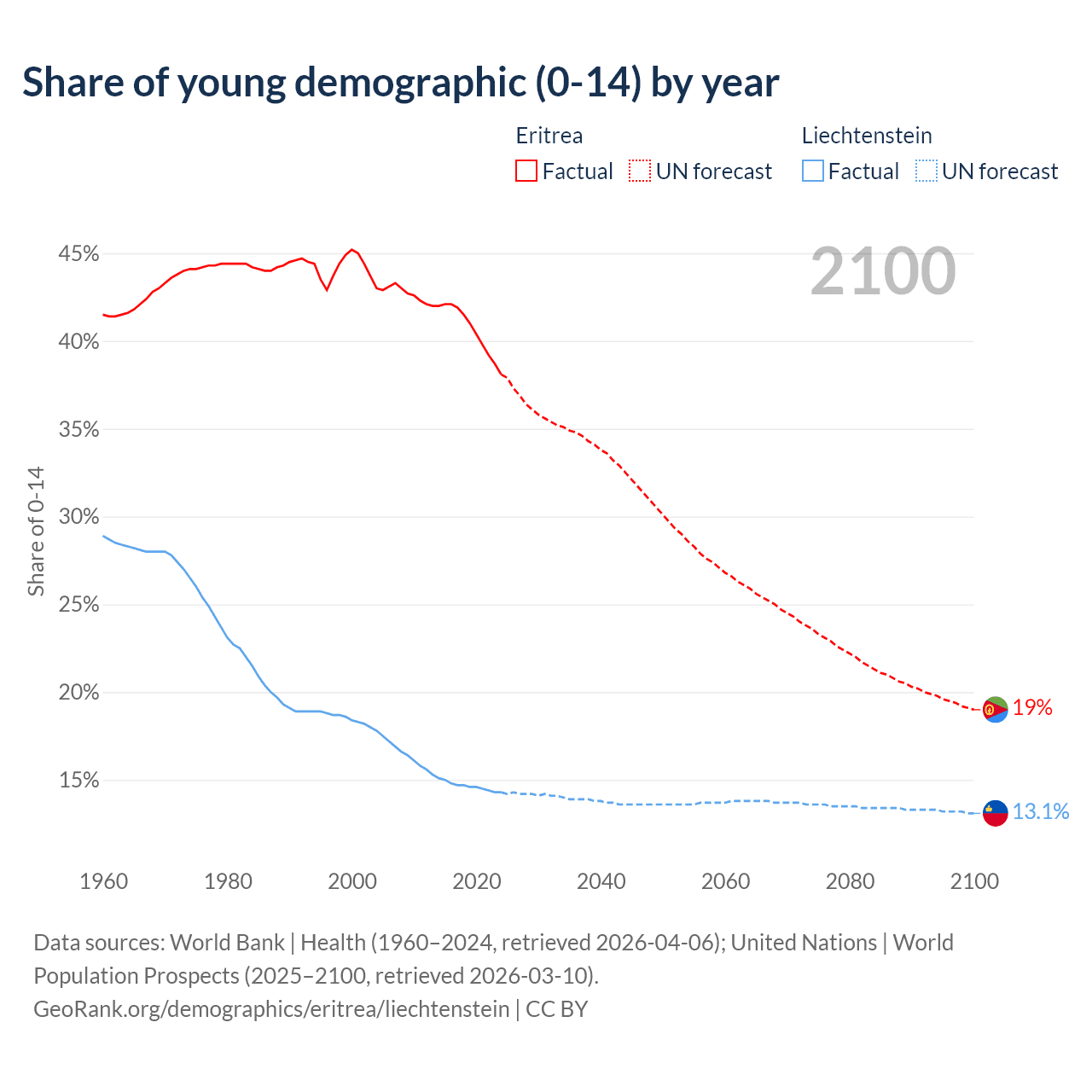 - The share of young demographic (0-15 years old) in Eritrea is 38.1% vs 14.3% in Liechtenstein.