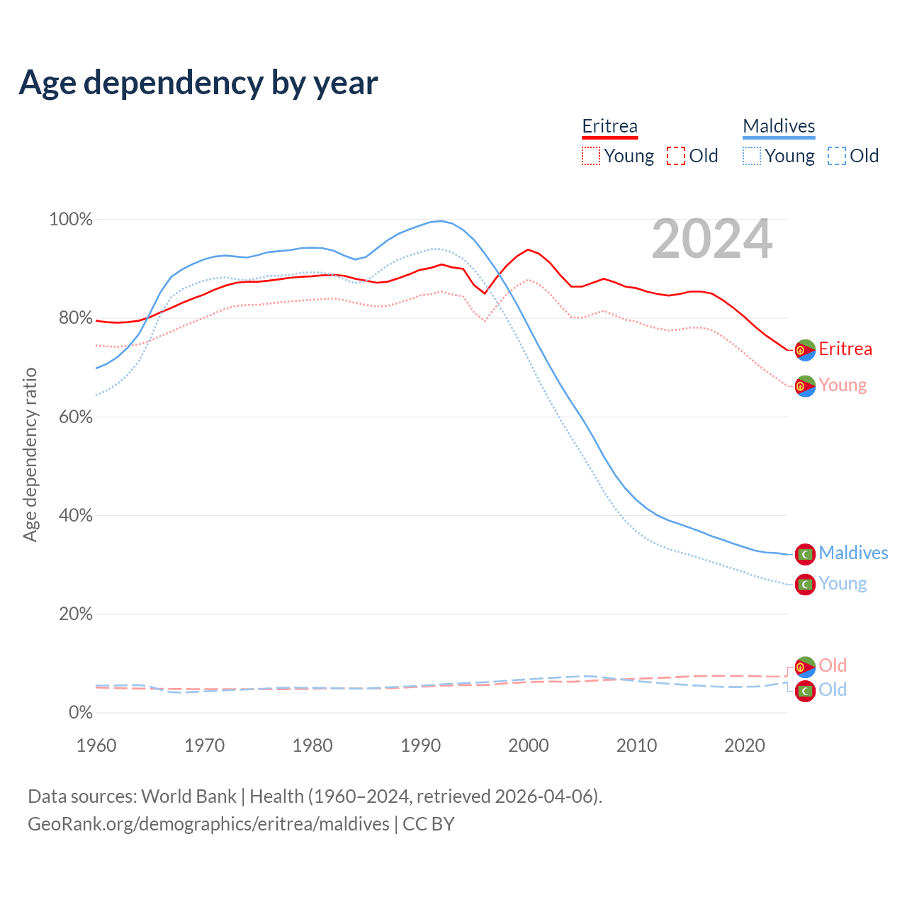 Data sources: World Bank | Health (1960–2024, retrieved 2026-04-06); U.S. Census Bureau (1960–2024, retrieved 2026-02-08).