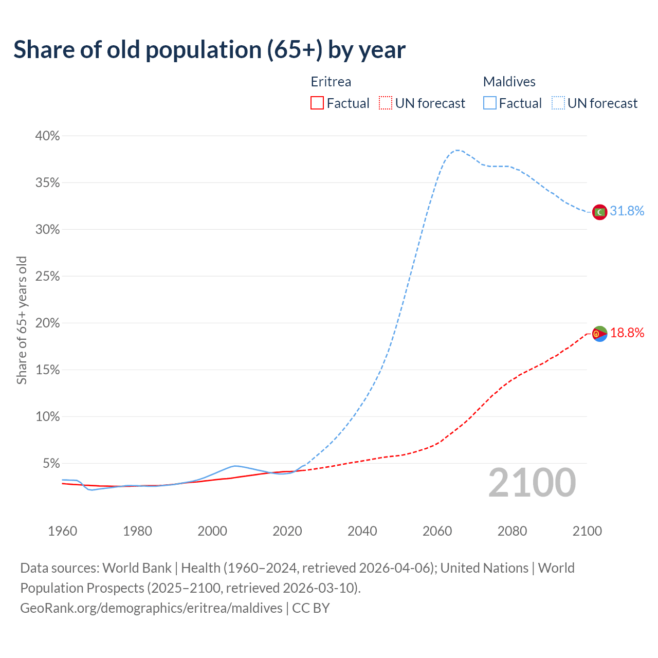 The share of older people aged 65 and over is 4.2% in Eritrea and 4.64% in Maldives. Life expectancy in Eritrea compared to Maldives .