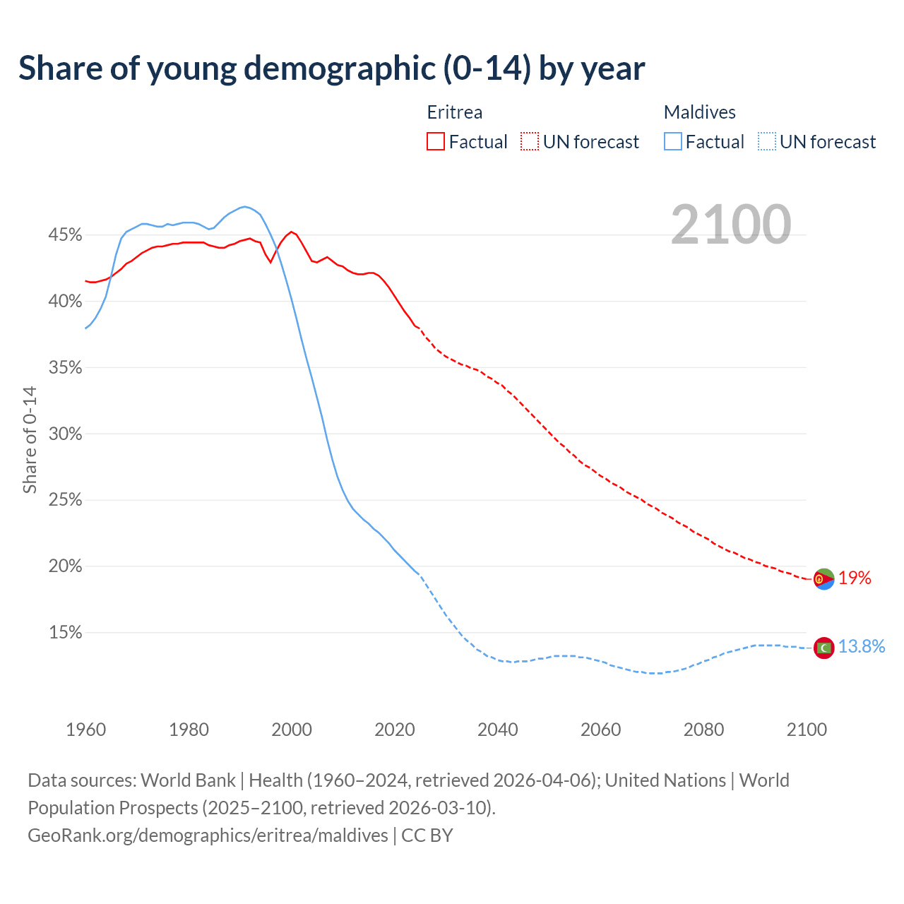 - The share of young demographic (0-15 years old) in Eritrea is 38.1% vs 19.6% in Maldives.