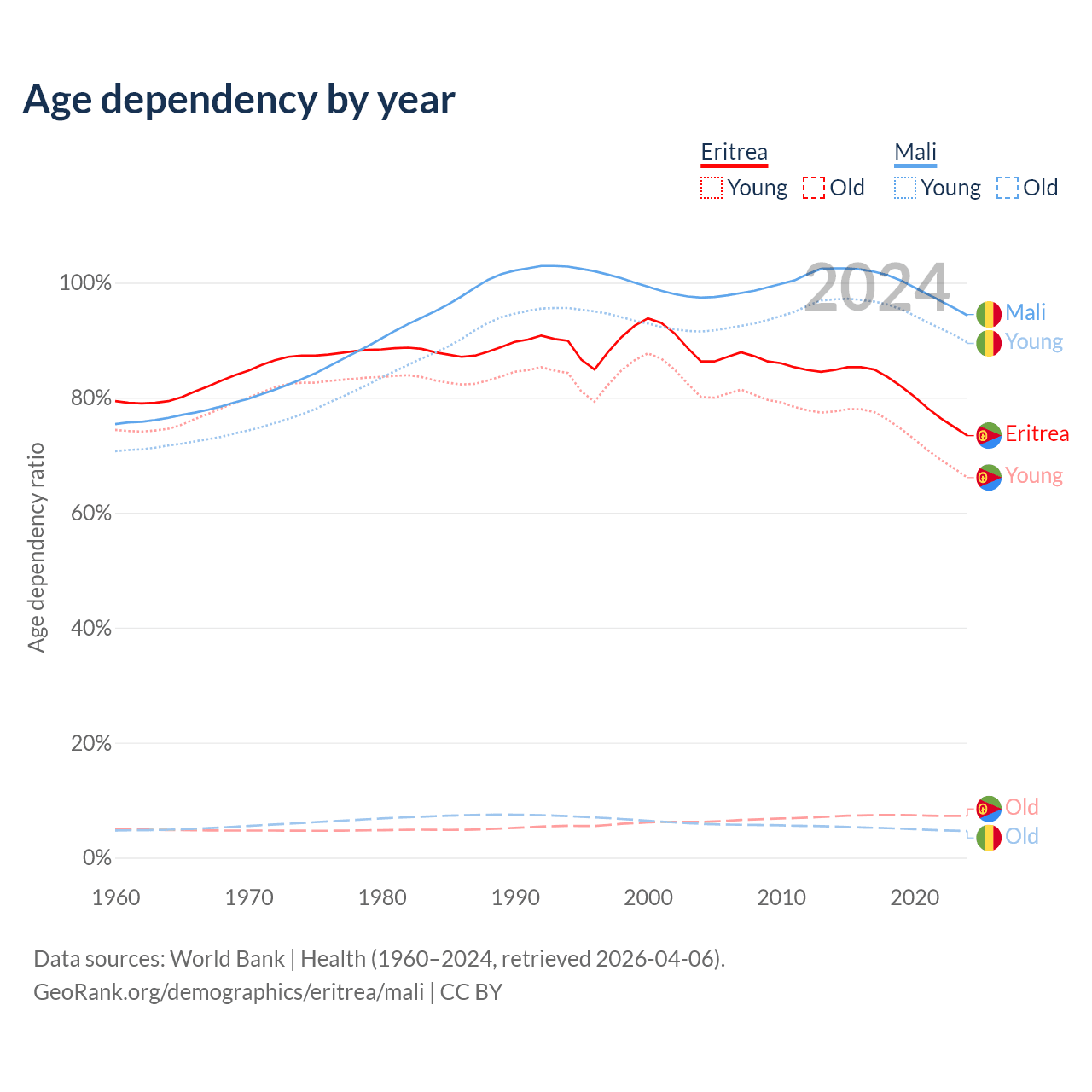 - The share of old-age demographic (65+) in Eritrea is 4.2% vs 2.38% in Mali.