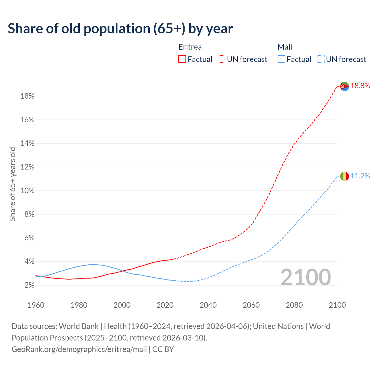 The share of older people aged 65 and over is 4.2% in Eritrea and 2.38% in Mali. Life expectancy in Eritrea compared to Mali .