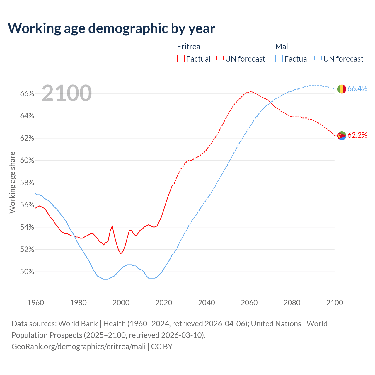 Median age Eritrea vs Mali, 1960-2100