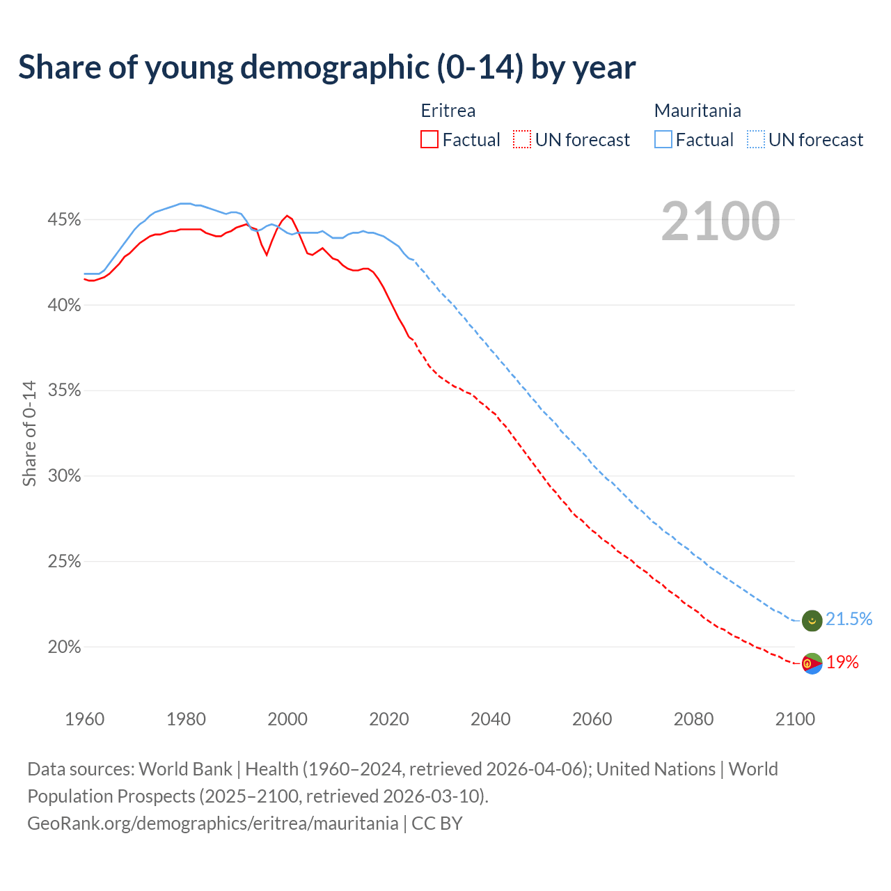 - The share of young demographic (0-15 years old) in Eritrea is 38.1% vs 42.7% in Mauritania.