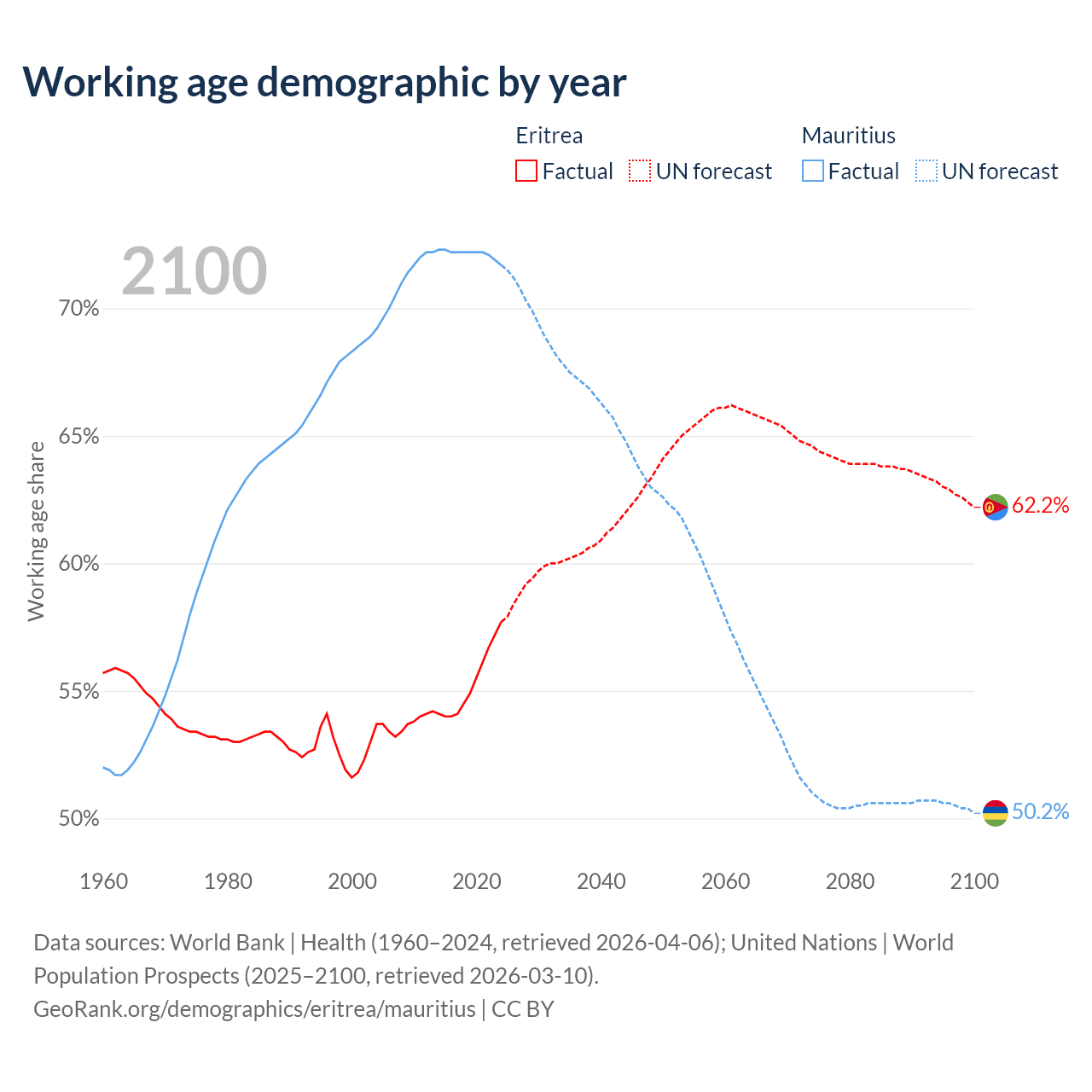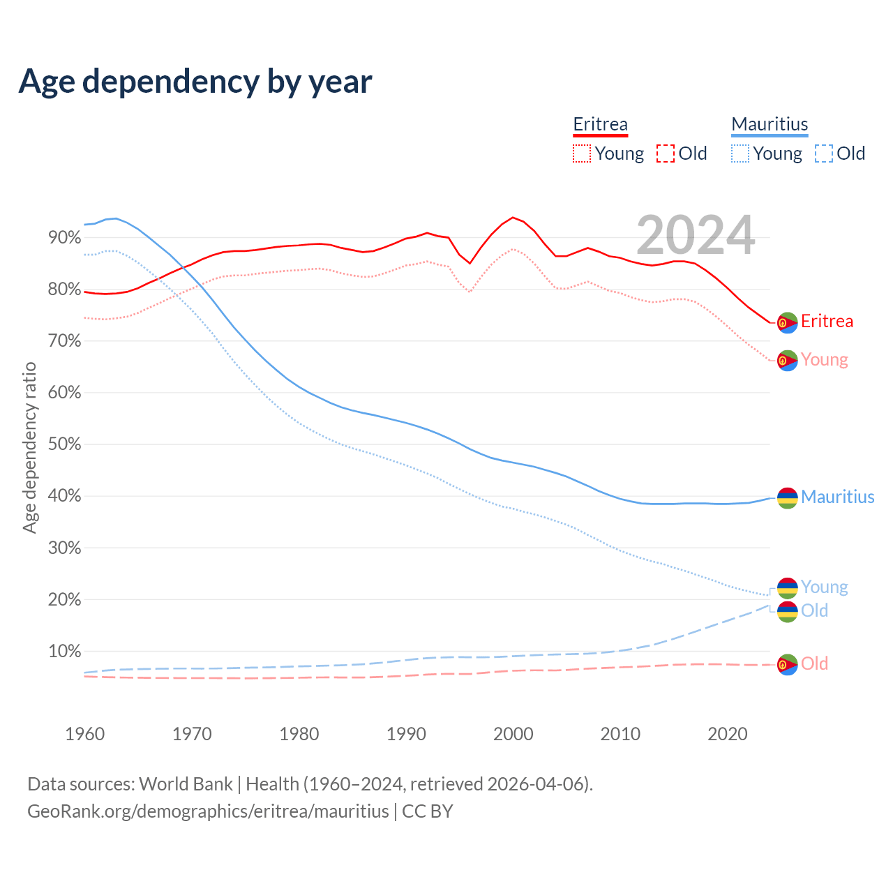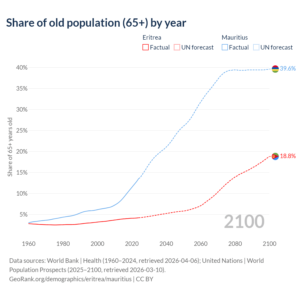 The share of older people aged 65 and over is 4.2% in Eritrea and 13.5% in Mauritius. Life expectancy in Eritrea compared to Mauritius .