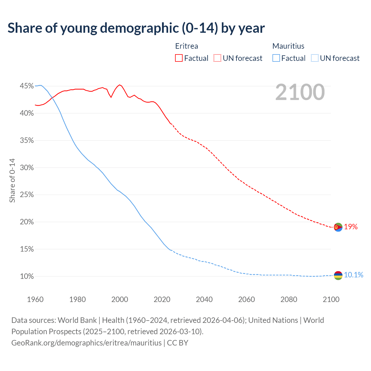 - The share of young demographic (0-15 years old) in Eritrea is 38.1% vs 14.8% in Mauritius.