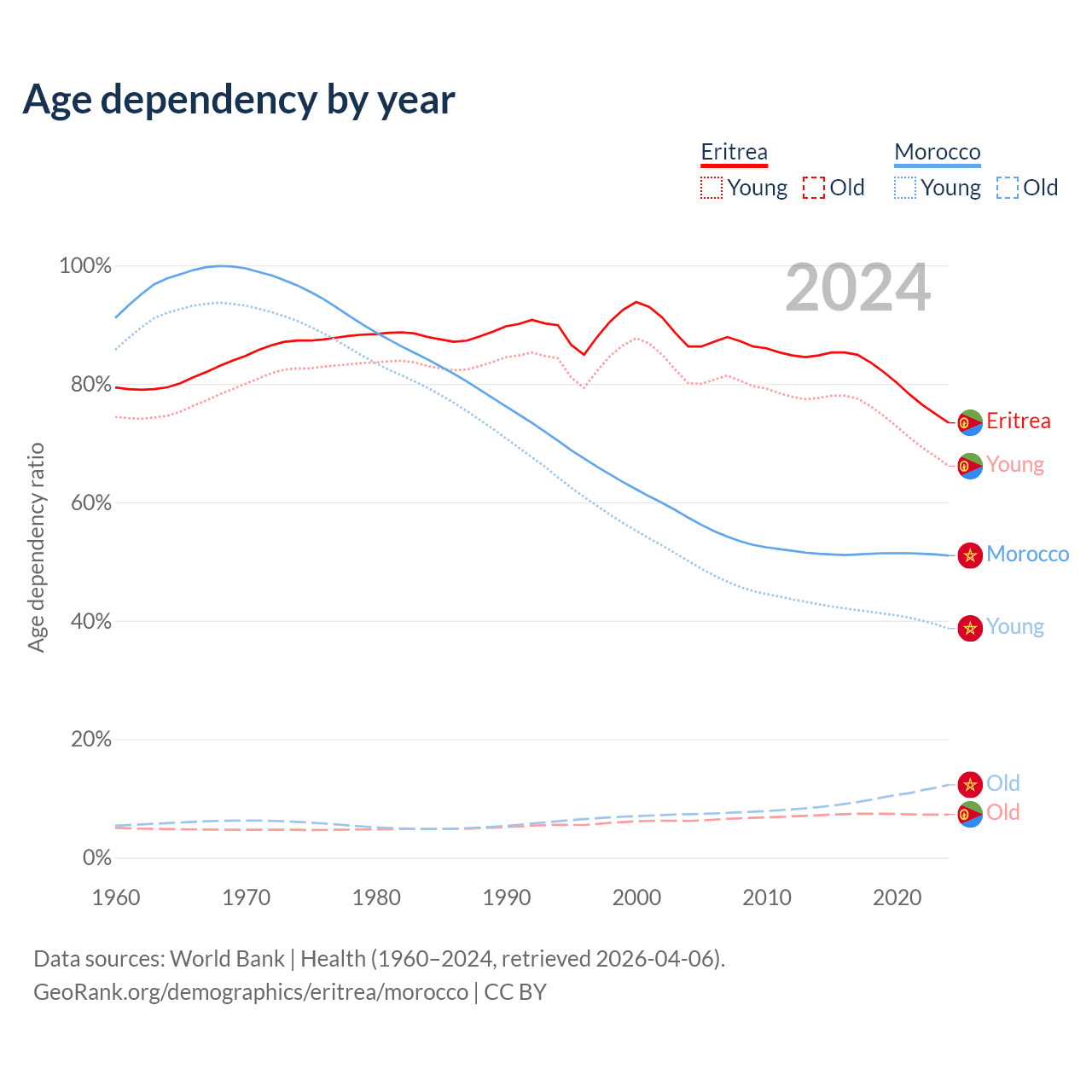 - Eritrea is ranked 168/196 by median age (oldest to youngest) vs 100/196 for Morocco.