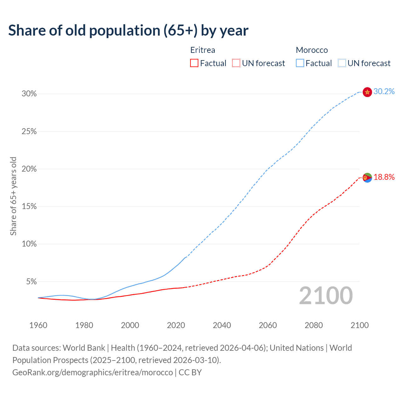 The share of older people aged 65 and over is 4.2% in Eritrea and 8.14% in Morocco. Life expectancy in Eritrea compared to Morocco .