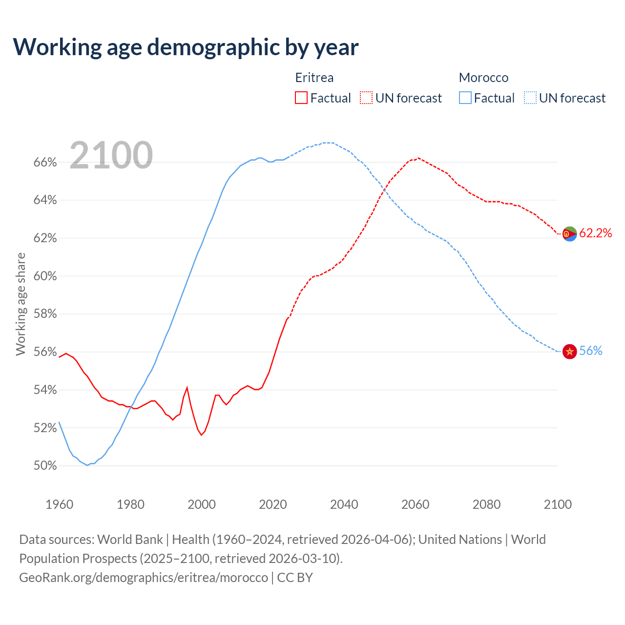 - Eritrea has 2.13M working age adults (aged 15-64) vs 25.7M in Morocco.