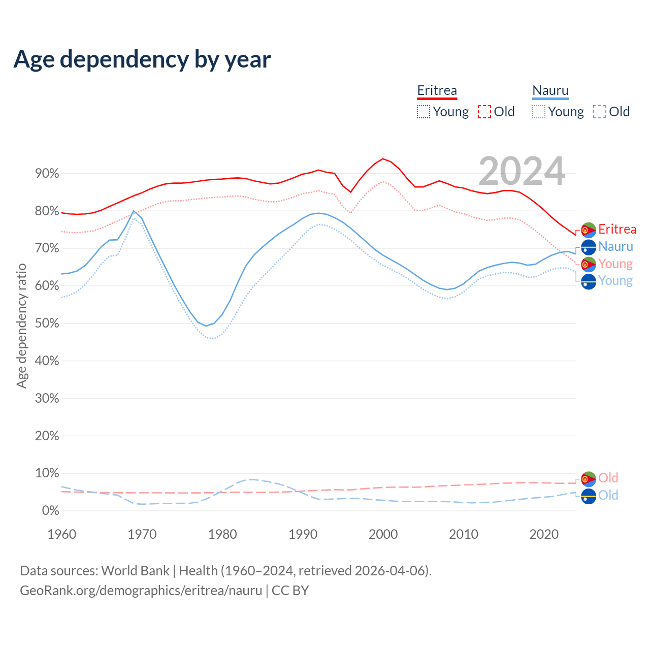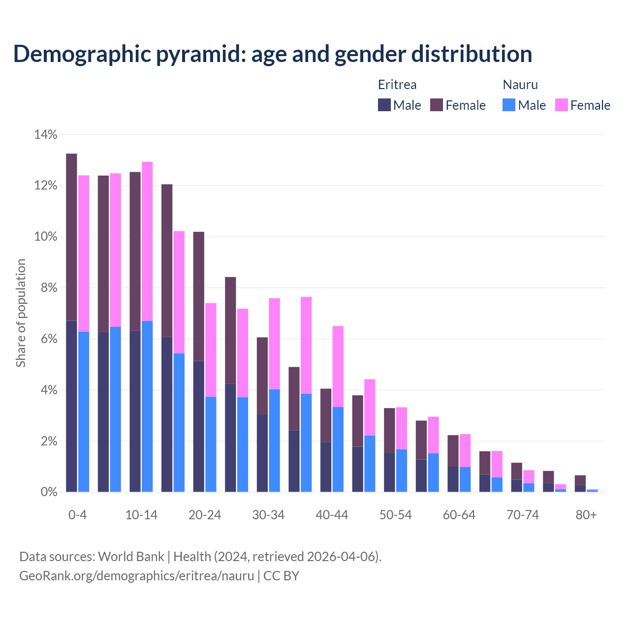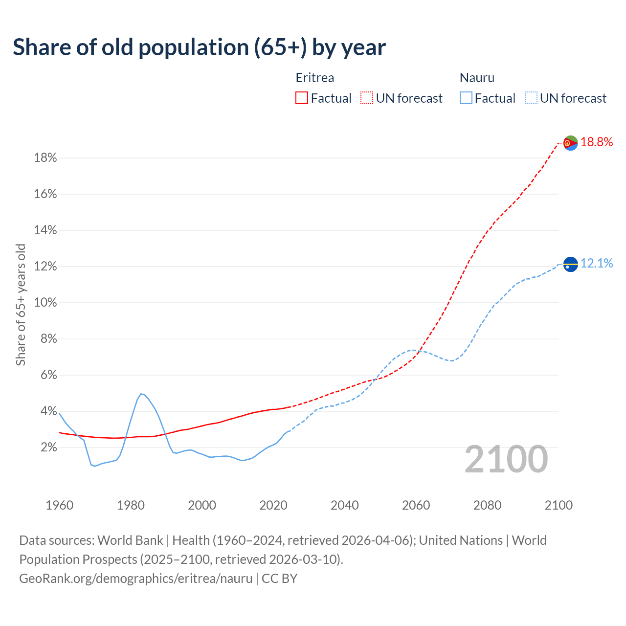 The share of older people aged 65 and over is 4.2% in Eritrea and 2.85% in Nauru. Life expectancy in Eritrea compared to Nauru .