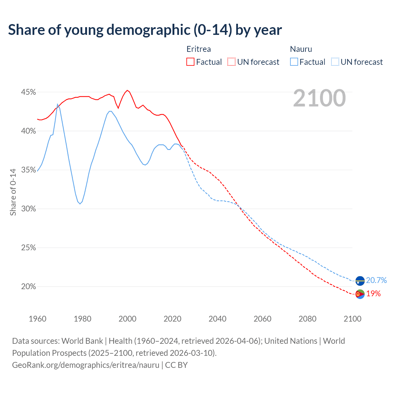 - The share of young demographic (0-15 years old) in Eritrea is 38.1% vs 37.8% in Nauru.