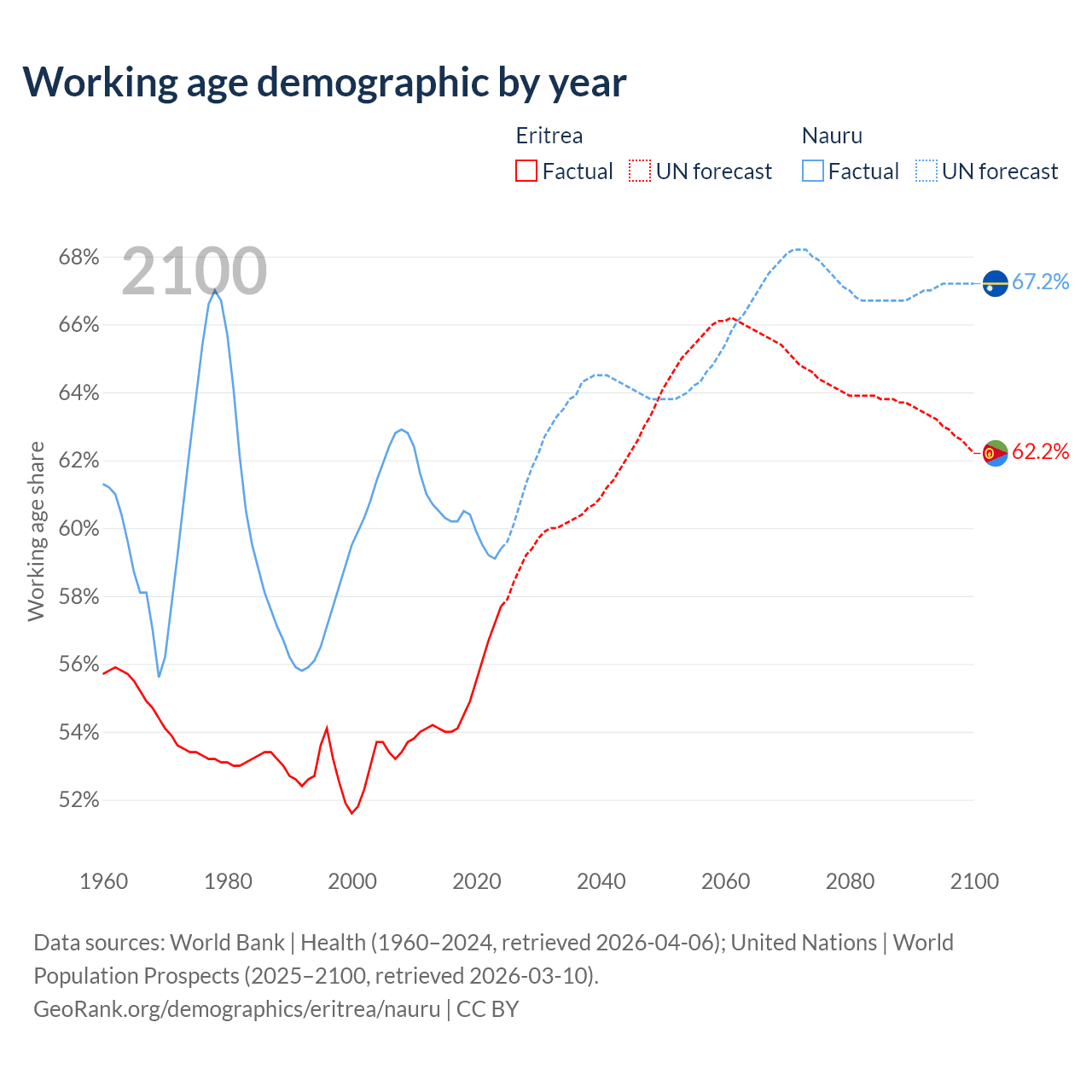 - Eritrea has 2.13M working age adults (aged 15-64) vs 7.2K in Nauru.