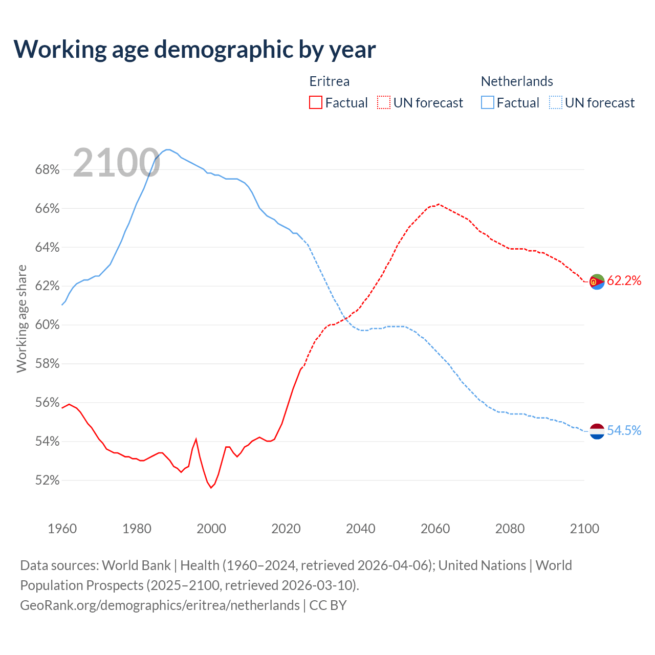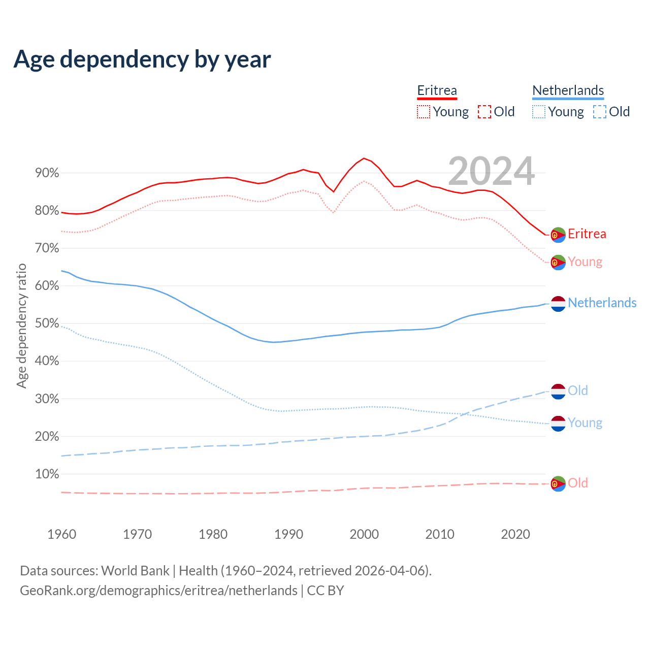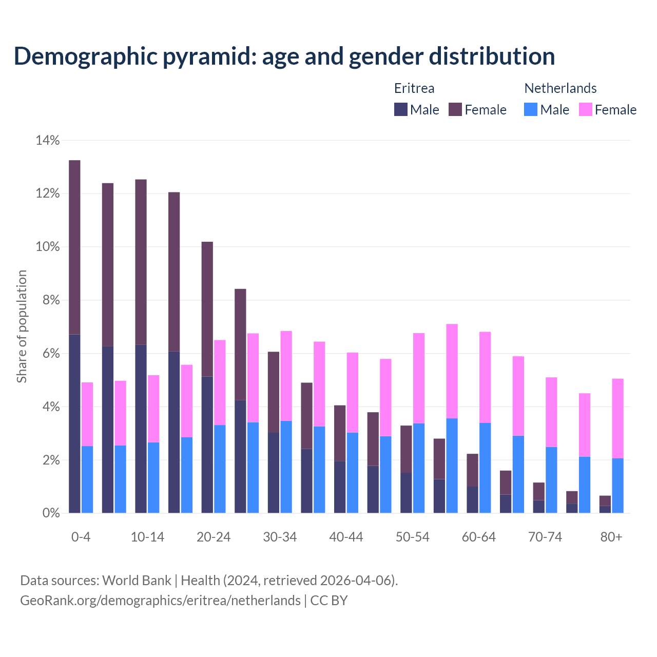 - The share of old-age demographic (65+) in Eritrea is 4.2% vs 20.5% in the Netherlands.