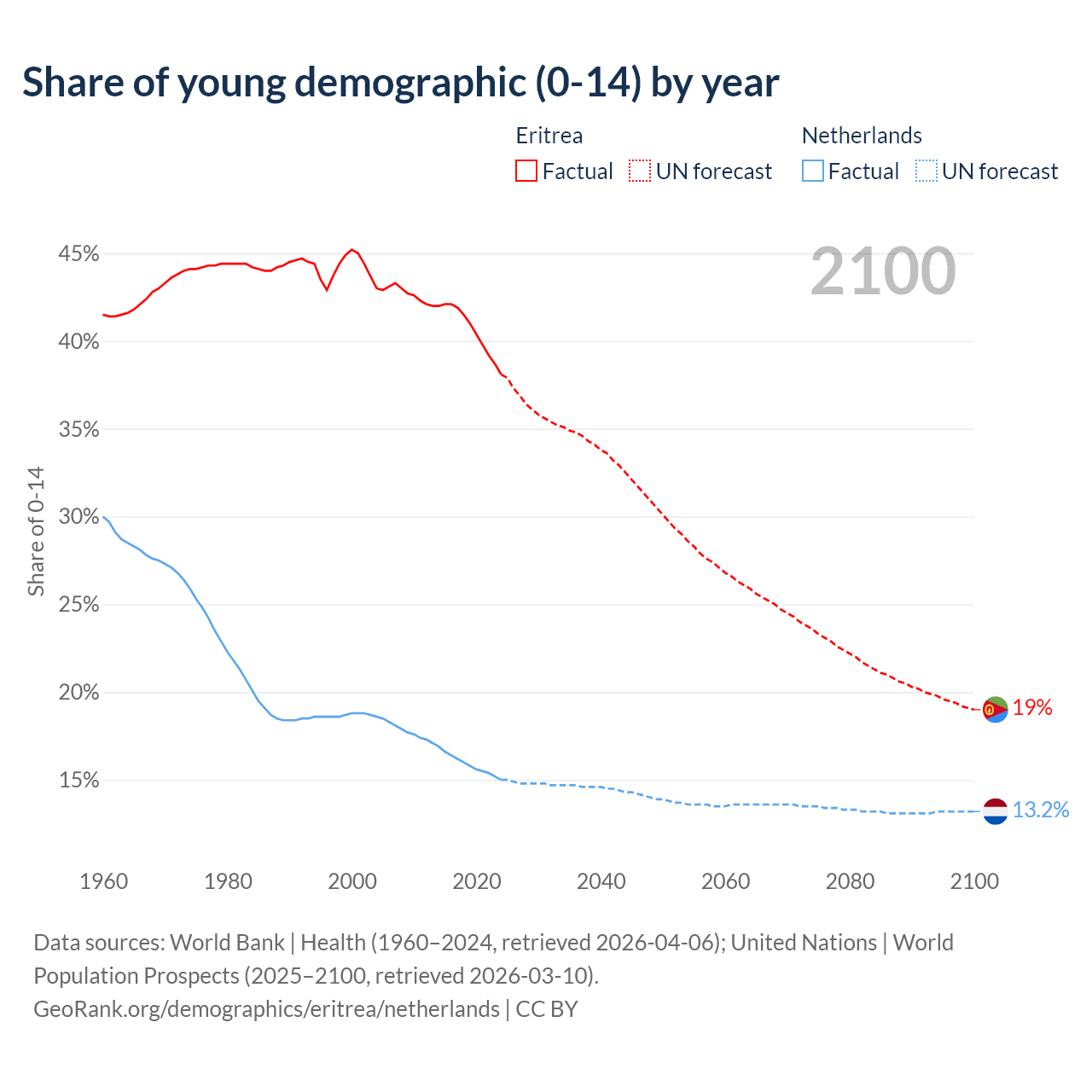 - The share of young demographic (0-15 years old) in Eritrea is 38.1% vs 15% in the Netherlands.