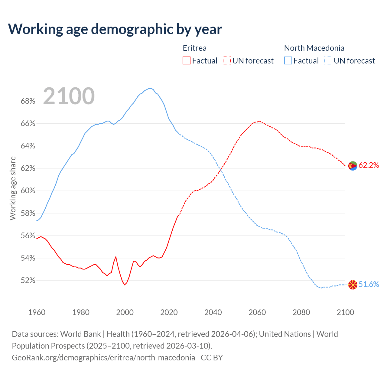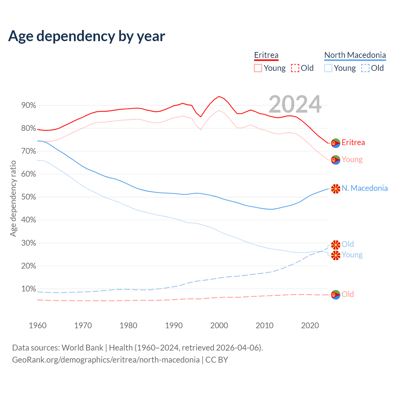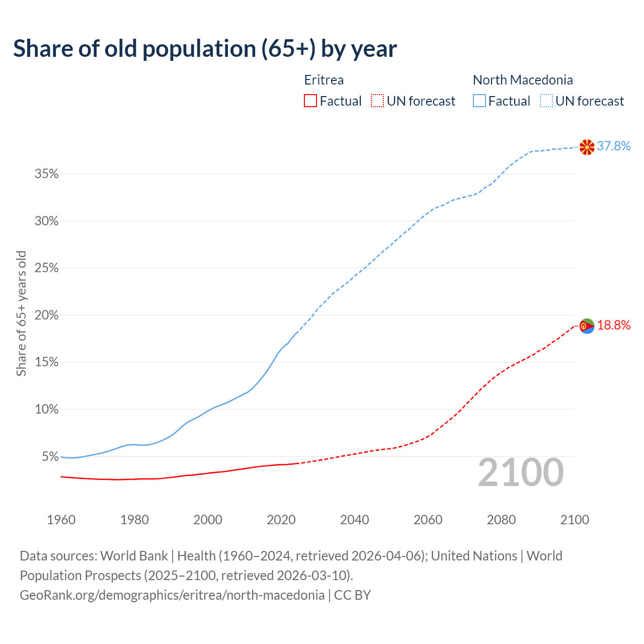 The share of older people aged 65 and over is 4.2% in Eritrea and 18% in North Macedonia. Life expectancy in Eritrea compared to North Macedonia .