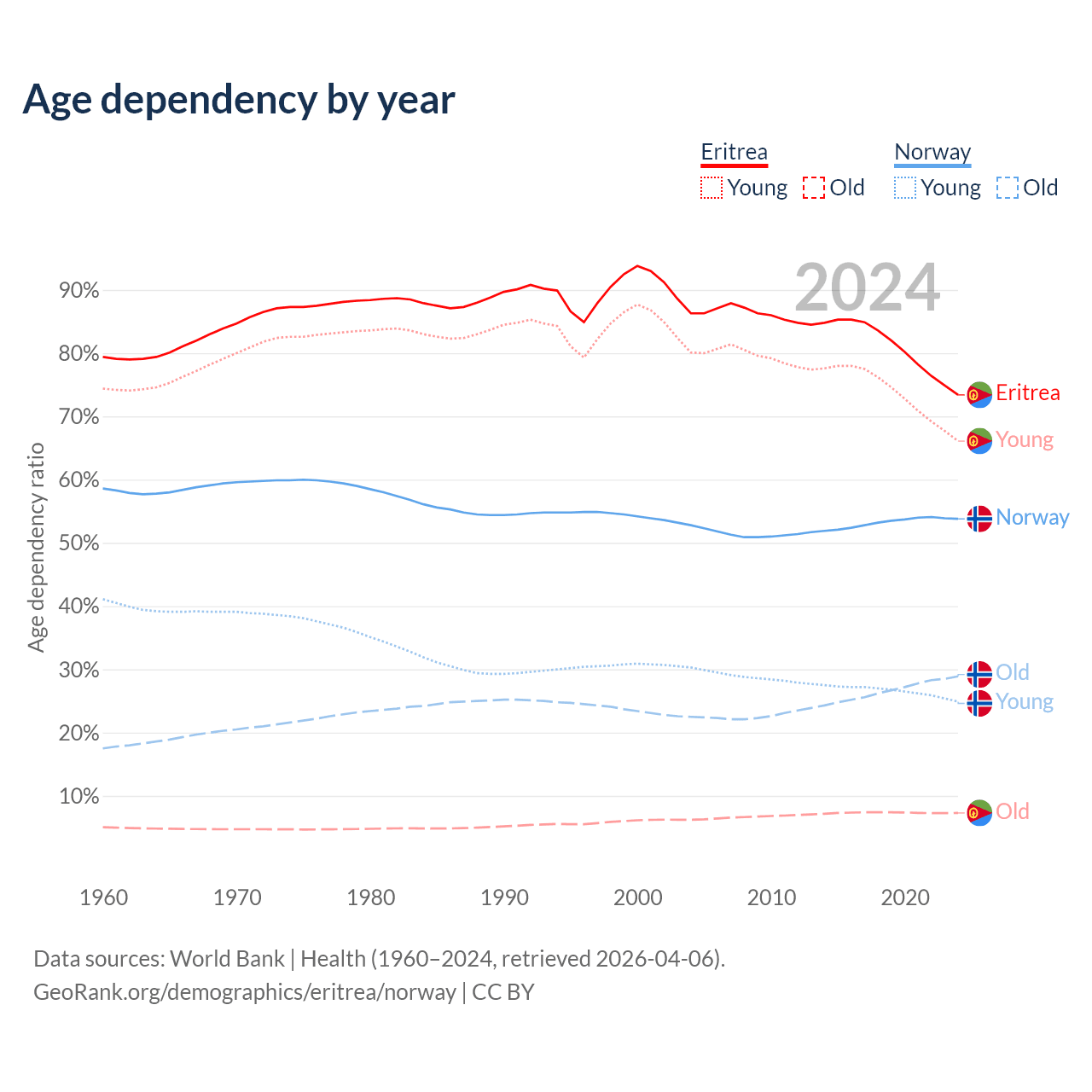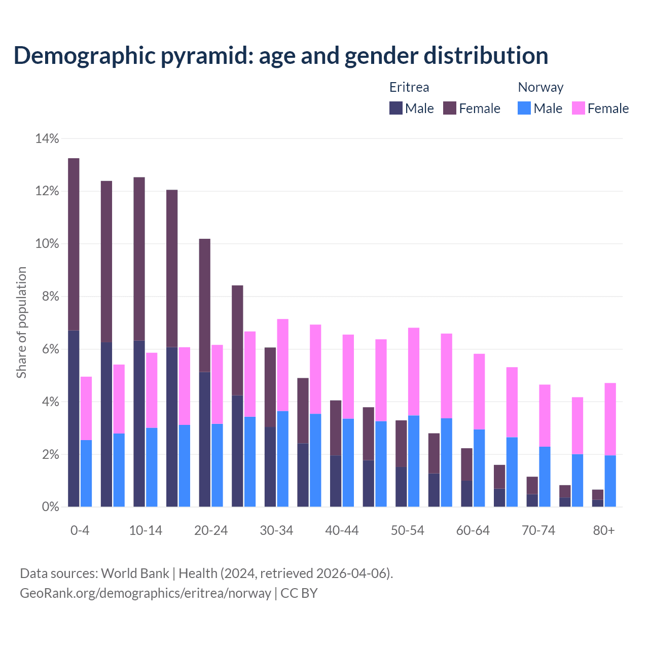 - The share of old-age demographic (65+) in Eritrea is 4.2% vs 18.8% in Norway.