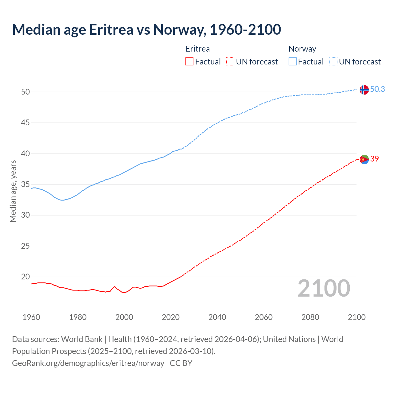 - The median age in Eritrea is 19.9 years compared to 40.7 years in Norway.