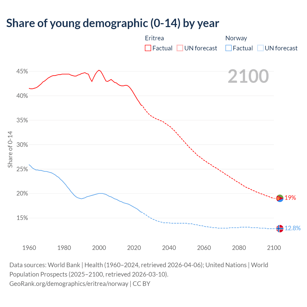 - The share of young demographic (0-15 years old) in Eritrea is 38.1% vs 16.2% in Norway.