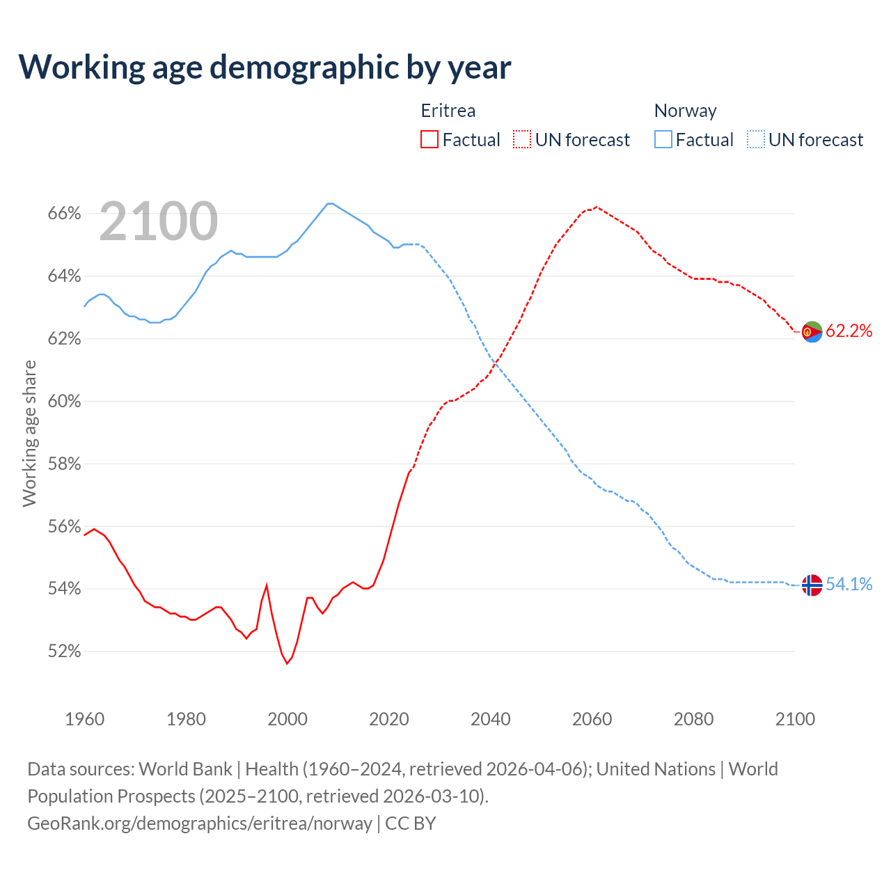 - Eritrea has 2.13M working age adults (aged 15-64) vs 3.69M in Norway.