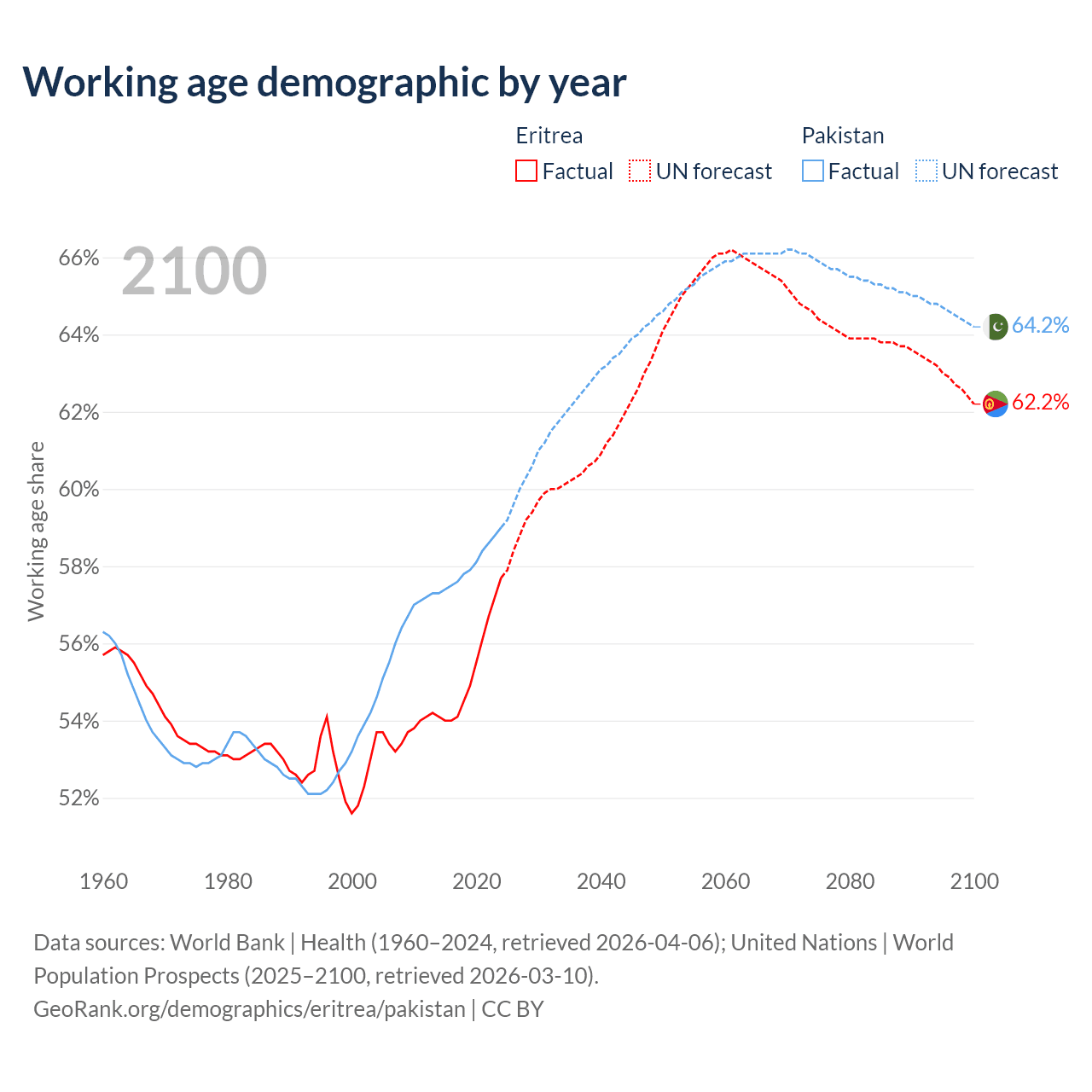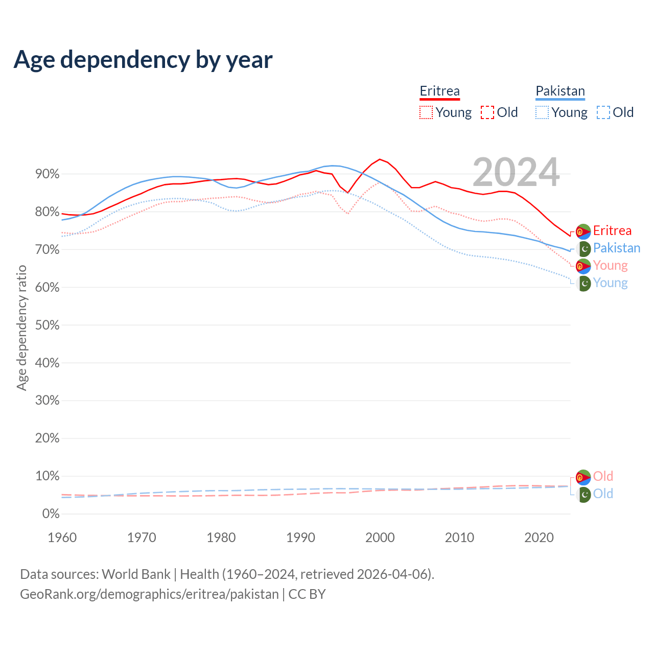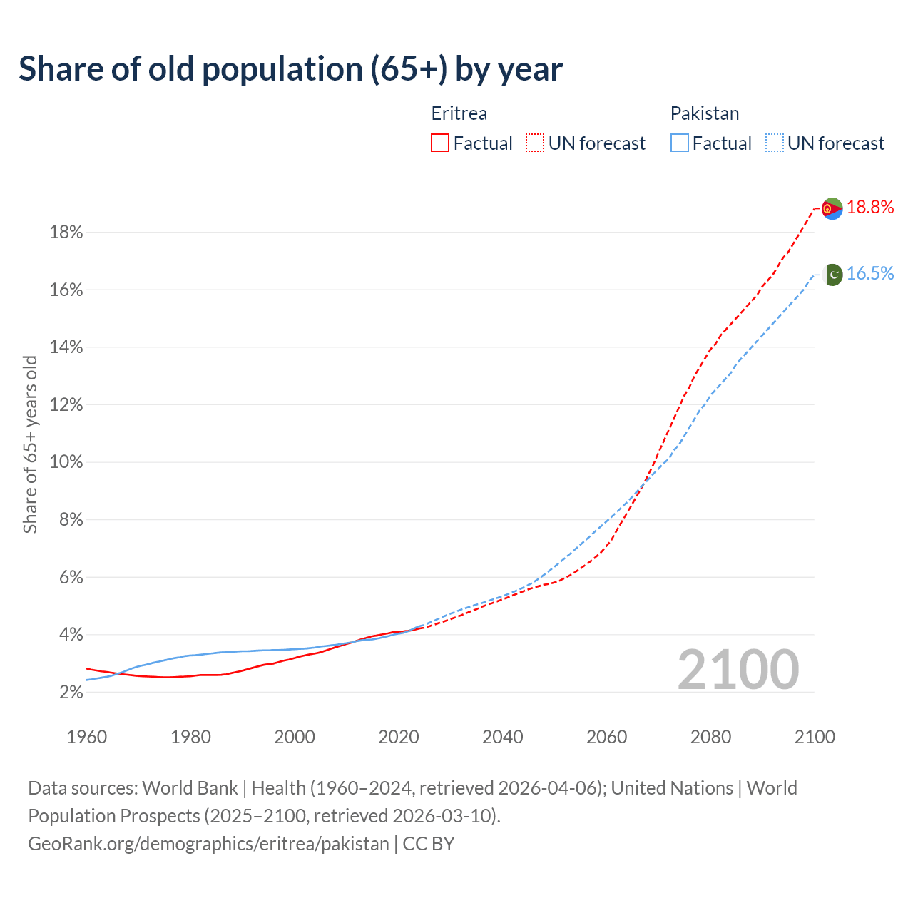 The share of older people aged 65 and over is 4.2% in Eritrea and 4.28% in Pakistan. Life expectancy in Eritrea compared to Pakistan .
